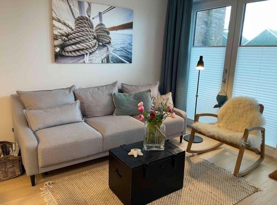 Besucher können die nach Südwesten ausgerichtete und windgeschützte Terrasse genießen, die teils überdacht ist und viel Sonnenwärme speichert. Die Möblierung umfasst eine große Ess-/Sitzgruppe sowie Sonnenliegen mit Auflagen. In der Zeit vom 1. Mai bis 15. September steht zusätzlich ein privater Strandkorb am Strand zur Verfügung. Die Gartenpforte und Terrassentür lassen sich mit dem Wohnungsschlüssel abschließen, um Sicherheit zu gewährleisten. Damit ist der Außenbereich ideal für entspannte Tage an der Küste.