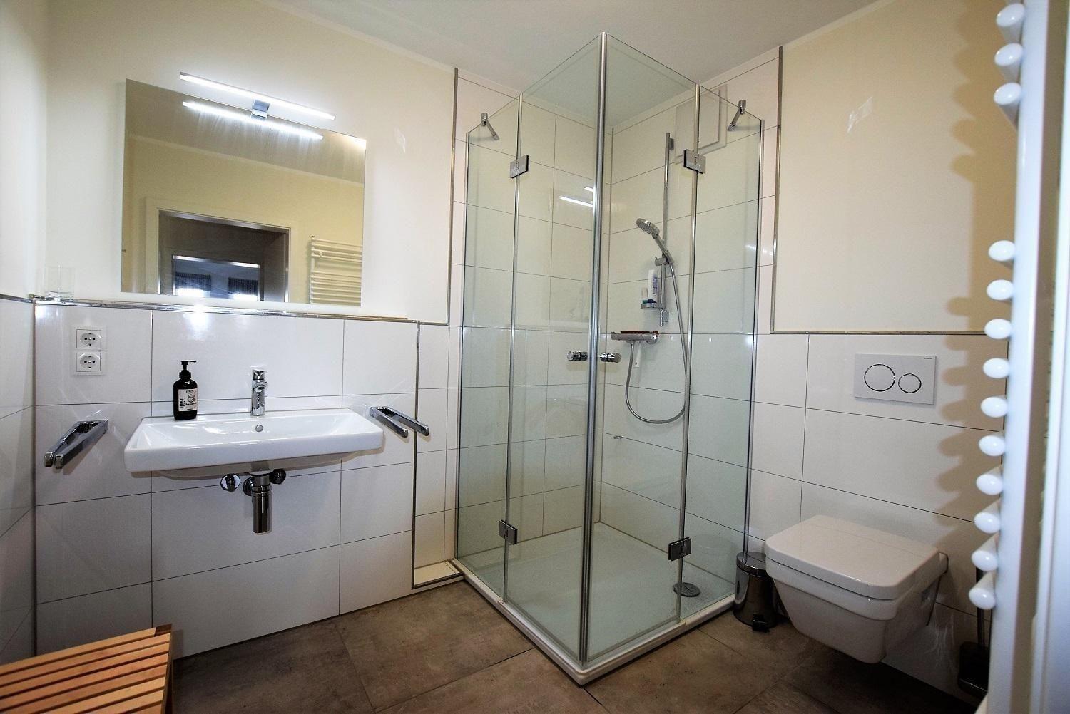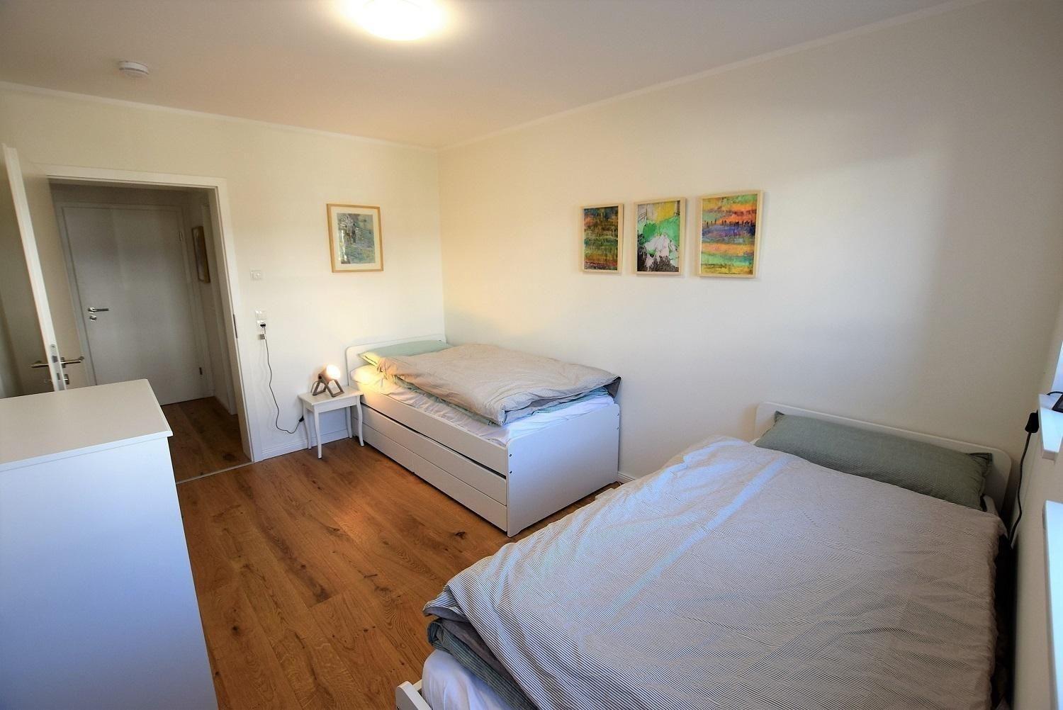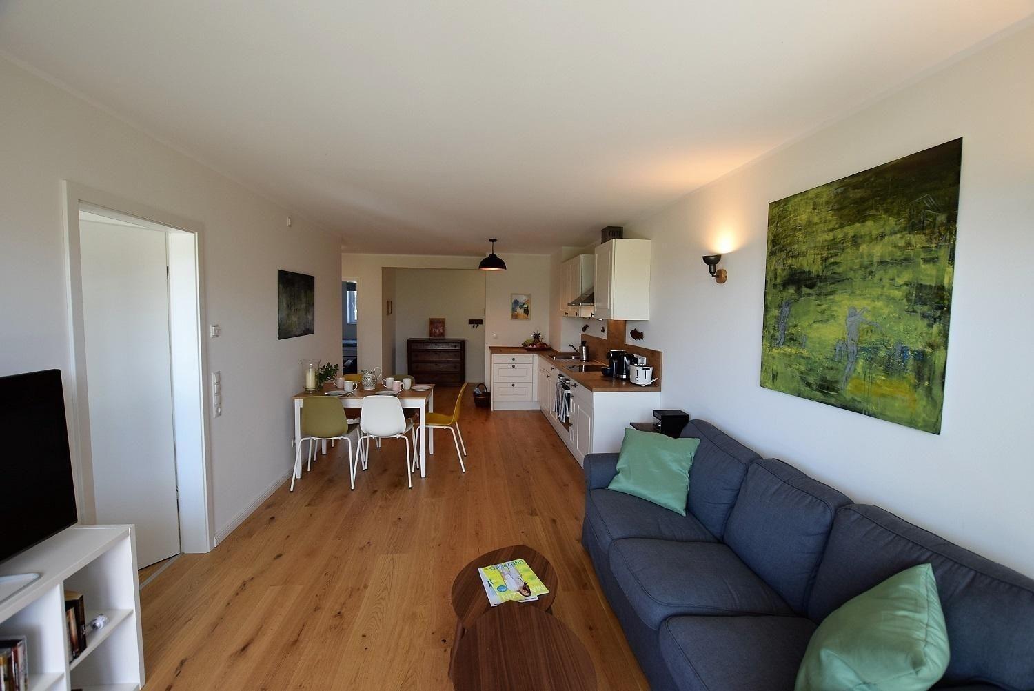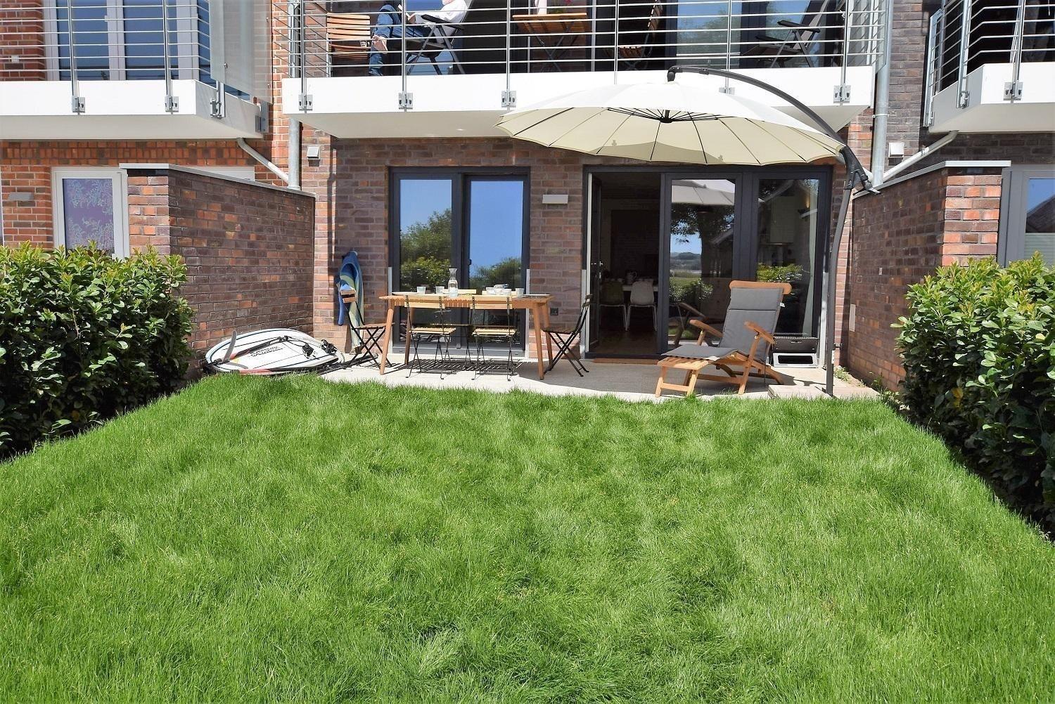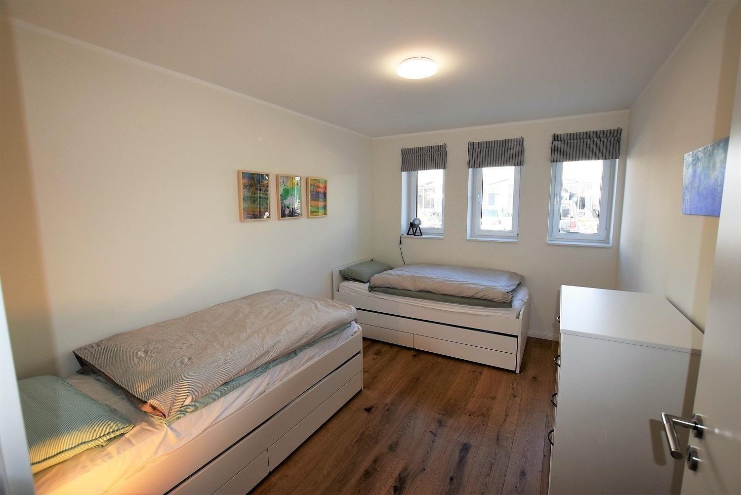 Die große, moderne Ferienwohnung „Beachstart“ im Erdgeschoss bietet auf 74 qm ausreichend Platz für bis zu 4 Personen. Sie verfügt über zwei helle Schlafzimmer: ein Zimmer mit Doppelbett und geräumigem Kleiderschrank sowie ein weiteres Zimmer mit zwei ausziehbaren Einzelbetten und ebenfalls einem Kleiderschrank. Das weitläufige Wohnzimmer besticht durch große Fenster und einen direkten Zugang zur möblierten Terrasse. Ein gemütlicher Wohnbereich mit Sofa und ein Flach-TV garantieren Entspannung. Der offene Küchenbereich ist modern ausgestattet, einschließlich Geschirrspüler und Ceran-Herd mit Backofen. Die Ferienwohnung verfügt über ein Vollbad mit Dusche und WC sowie einen Hauswirtschaftsraum mit Waschmaschine zur alleinigen Nutzung. Kostenloses WLAN ist in der Unterkunft verfügbar. Ein Stellplatz für 1 PKW und zwei Fahrradabstell-Plätze im Nebenhaus sind ebenfalls vorhanden.