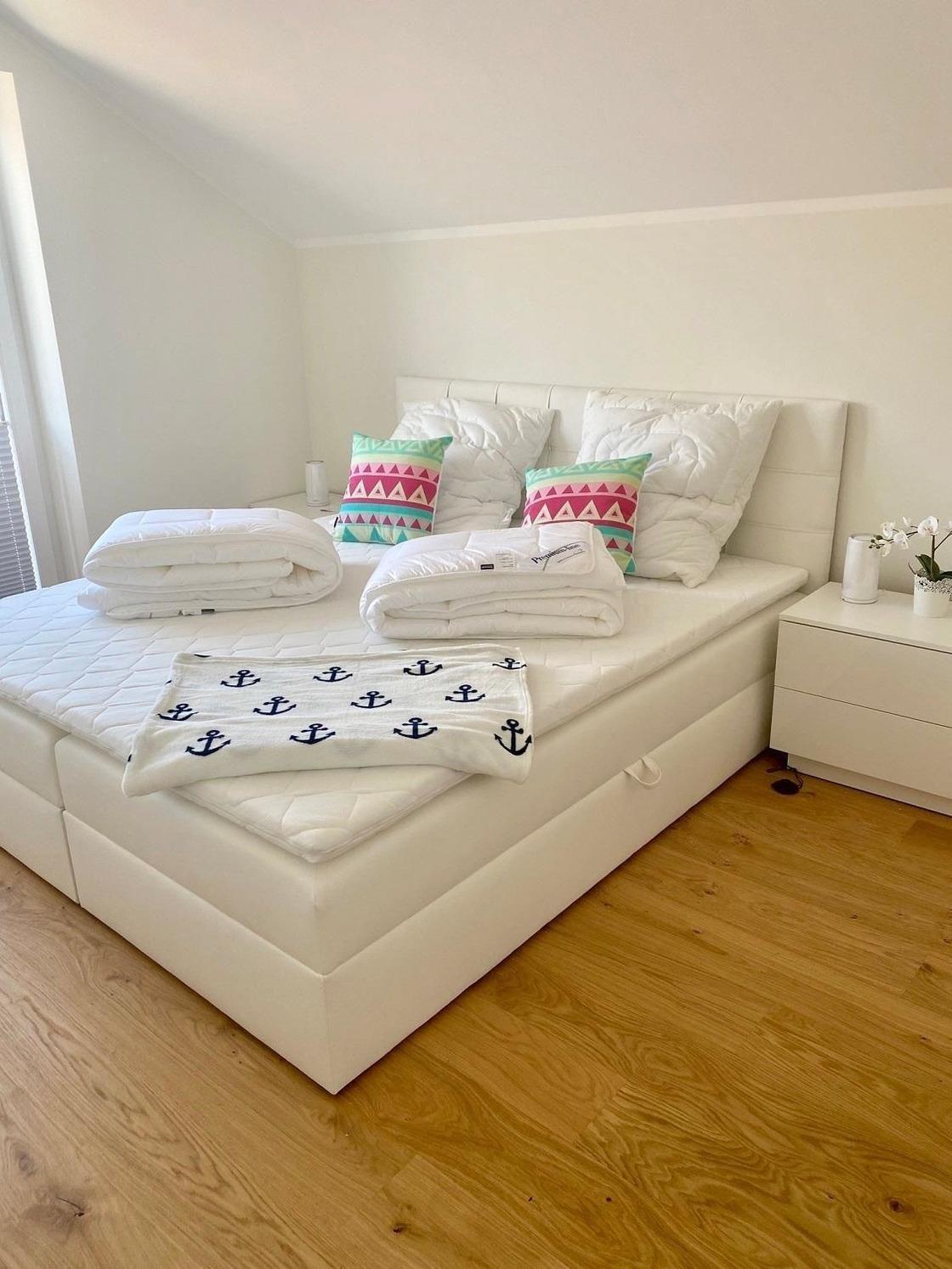 Die Ferienwohnung „Ostseesternchen“ in der Ferienanlage „Meeresblick“ bietet Platz für bis zu 4 Personen und besticht durch eine hochwertige, helle und moderne Einrichtung. Der lichtdurchflutete Wohnraum mit großer Fensterfront bietet Zugang zu einem Balkon, der auf die Ostsee blickt. Im Wohnbereich stehen ein gemütliches Sofa und ein Esstisch bereit, während die offene, umfassend ausgestattete Küche (inklusive Induktionsherd, Backofen und Spülmaschine) zum Kochen einlädt. Die Wohnung verfügt über zwei Schlafzimmer mit hochwertigen Betten und offenen Kleiderschränken sowie einen Schminktisch. Das Badezimmer ist mit einer bodentiefen Dusche ausgestattet. WLAN ist verfügbar. Ein Fahrstuhl erleichtert den Zugang, und ein Stellplatz für 1 PKW sowie für 2 Fahrräder sind vorhanden. Der saisonale Strandkorb kann von Mai bis September genutzt werden.