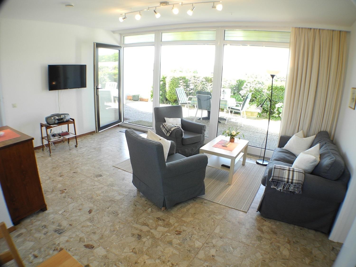 Cerankochfeld und teilweisem Blick auf die Ostseeküste, Wohnzimmer mit offenem Essbereich und Terrasse. Von dem hellen Essbereich, der Küche und von einem Schlafzimmer aus, schaut man direkt ins Grüne und auf die Ostsee. Die drei Schlafzimmer laden zum Träumen ein, ein Badezimmer mit Dusche und WC und ein separates Gäste-WC vervollständigen den Komfort. Auf der Terrasse hinter dem Haus finden Sie Terrassenmöbel und im angrenzenden Abstellraum einen Holzkohle-Grill zur freien Nutzung. Auf der herrlichen Frühstücksterrasse direkt vor dem Haus können Sie ein unvergessliches Frühstück bei Sonnenaufgang genießen.