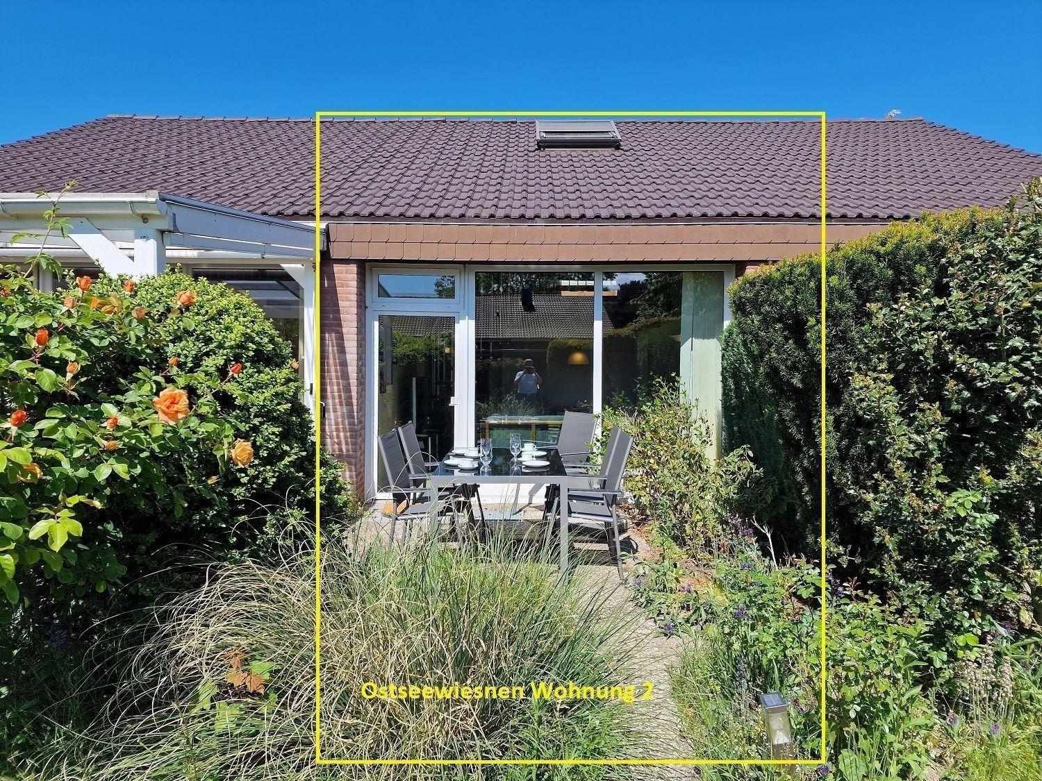 Die Ferienwohnung Ostseewiese bietet Platz für bis zu 4 Personen, überzeugt mit ruhiger Lage nahe einem feinen Sandstrand und einer einladenden Terrasse im idyllischen Gemeinschaftsgarten.