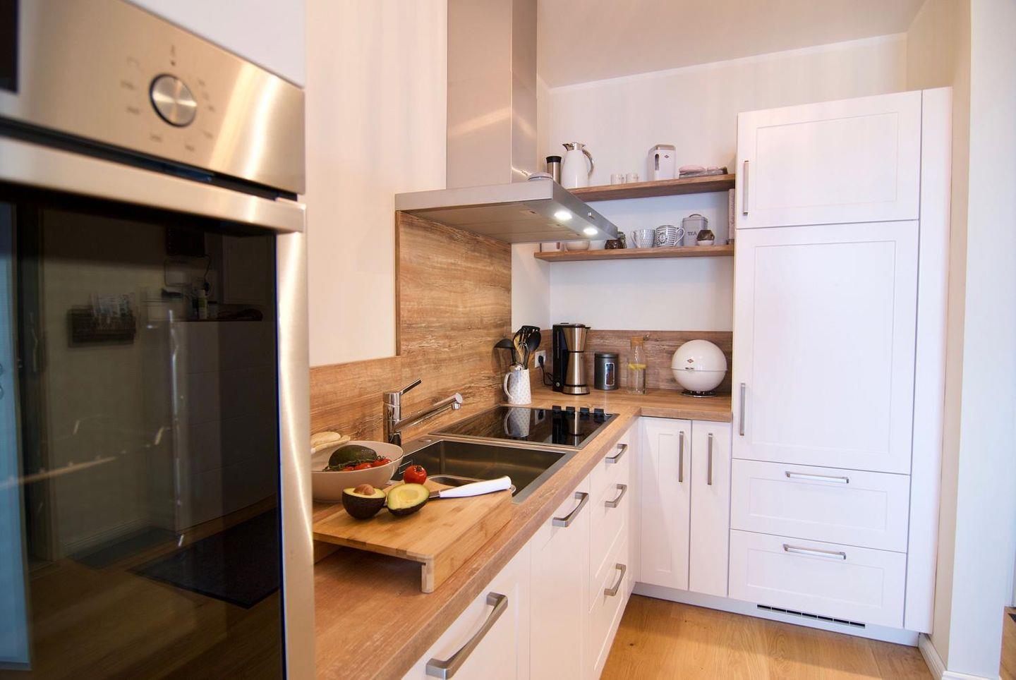Die Ferienwohnung ist hochwertig ausgestattet mit Echtholzparkett und Fußbodenheizung. Die Einbauküche umfasst Herd, Backofen, Geschirrspüler, Waschmaschine und Kühlschrank mit Gefrierfach. Ebenfalls vorhanden sind Elektrogeräte wie Kaffeemaschine, Wasserkocher, Eierkocher, Toaster und Staubsauger.