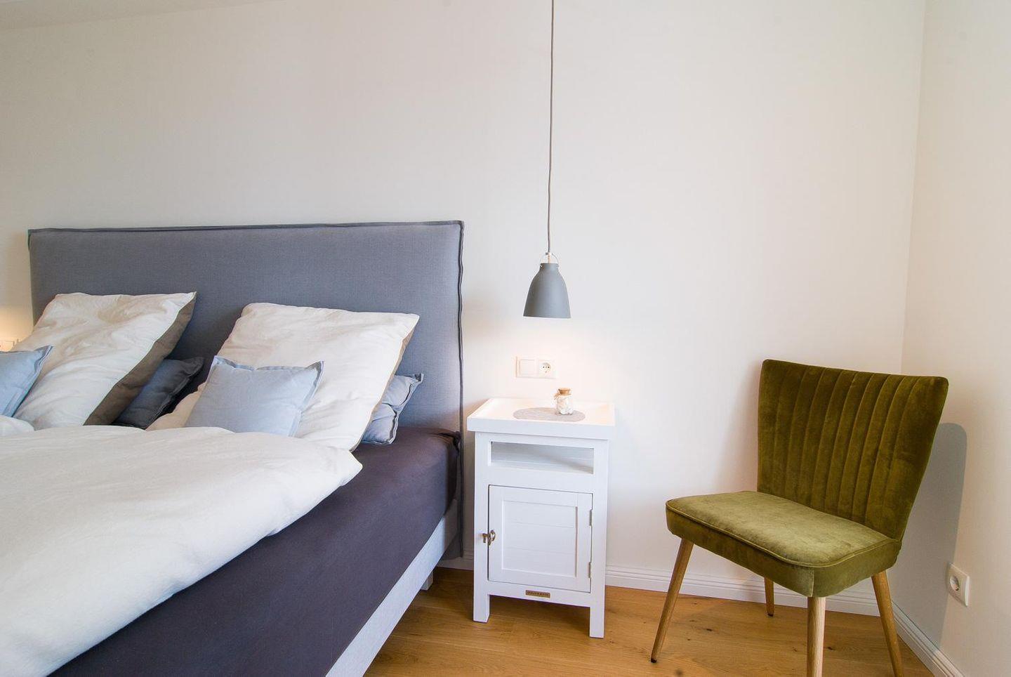 Das gemütliche Schlafzimmer mit Doppelbett sorgt für erholsame Urlaubsnächte. Freuen Sie sich auf ein hochwertiges Boxspringbett mit den Maßen 2,00 m x 2,00 m, speziell angefertigt für die Ferienwohnung von einer Kieler Bettenmanufaktur. Schlafen Sie mit Meeresrauschen ein und wachen Sie mit Blick auf das Meer auf. Ein großer Kleiderschrank mit Schiebetüren und Ganzkörperspiegel wurde ebenfalls integriert, so dass reichlich Stauraum vorhanden ist.
