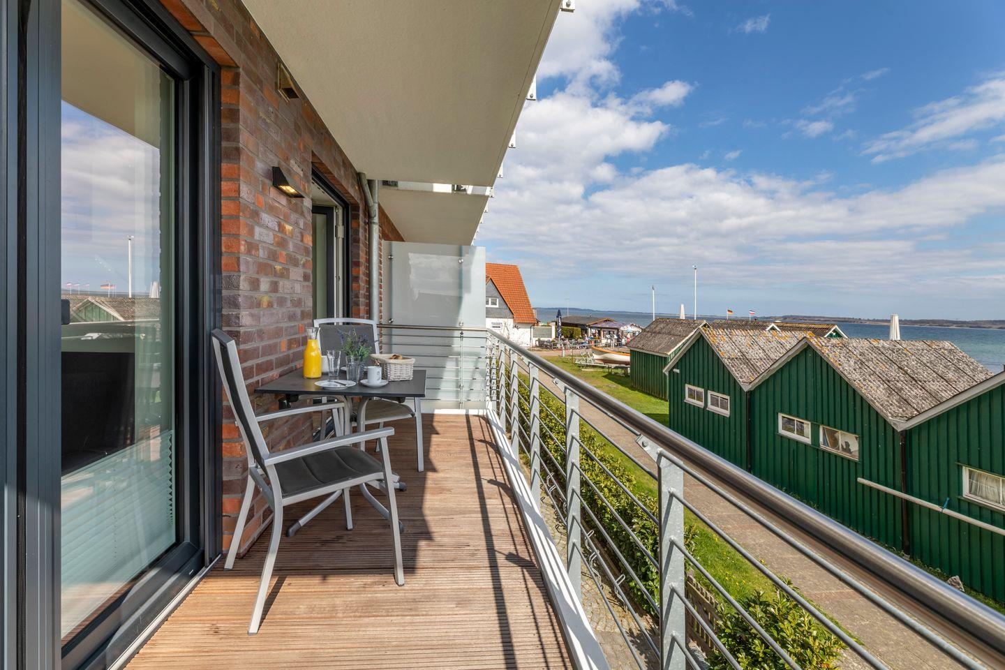 Direkt vom Wohnraum aus kann der schöne Balkon der Wohnung betreten werden. Hier kann nicht nur die Aussicht auf die mal ruhige, mal schäumende See genossen werden, sondern auch ein fantastischer Ausblick . Durch seine Lage bietet der Außenbereich pünktlich zum Frühstück Sonne, die sich den ganzen Tag über hält.