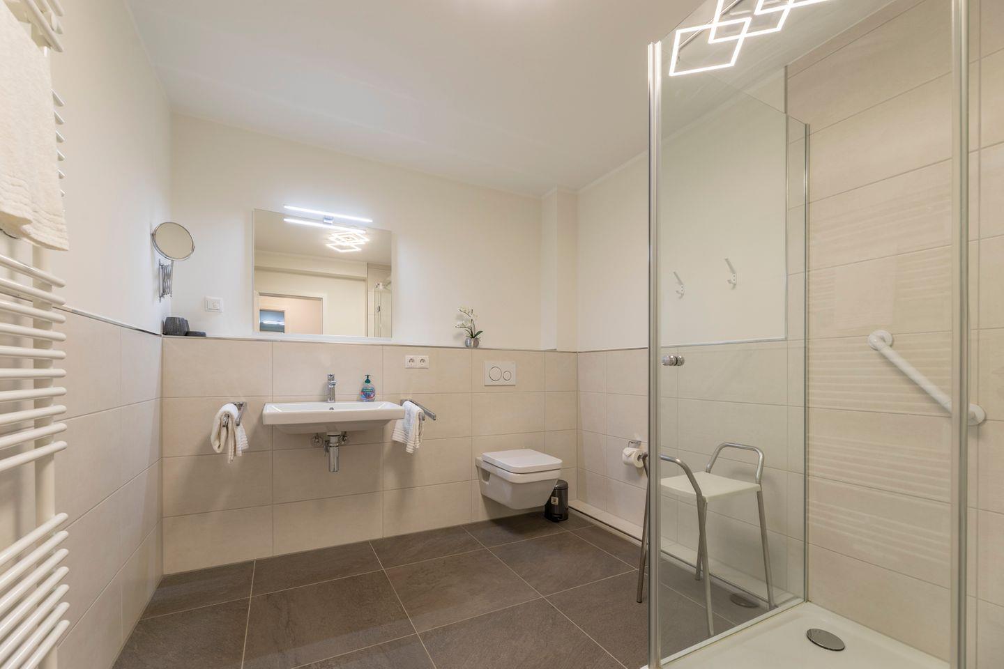 Die Dusche im Badezimmer ist bodentief und lässt sich mit einer Glastür verschließen. Helle Fliesen sorgen für einen modernen Gesamteindruck. Deckenspots, ein Waschtisch mit großem Spiegel und ein Fön sind hier ebenso vorhanden wie ein Handtuchwärmer.