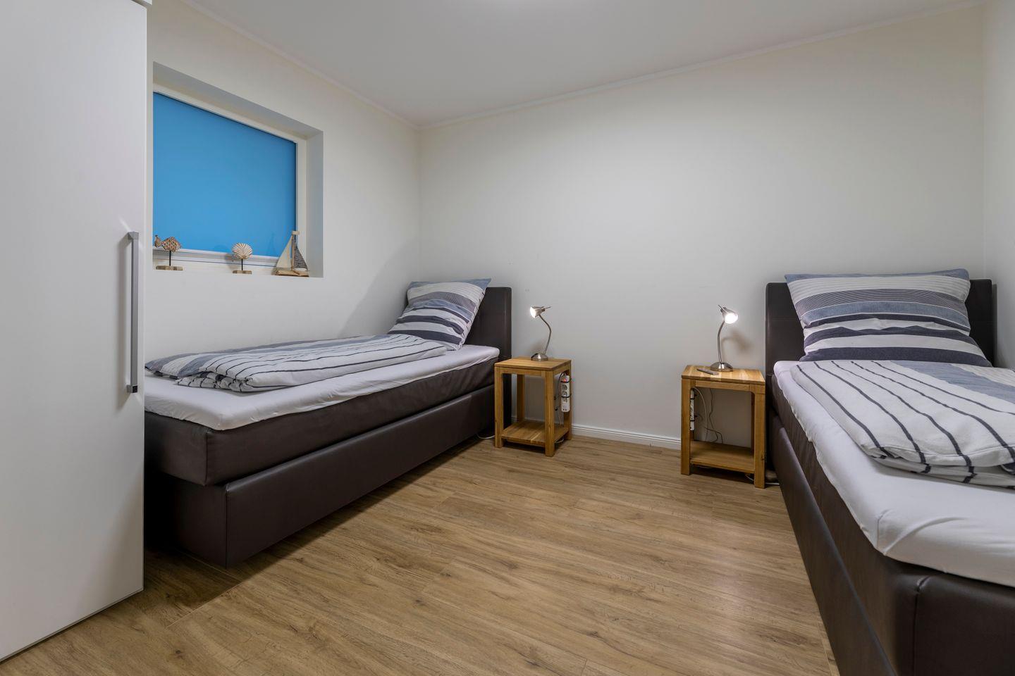 Das zweite Schlafzimmer verfügt über zwei Einzelbetten.