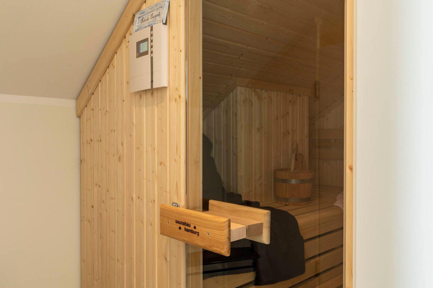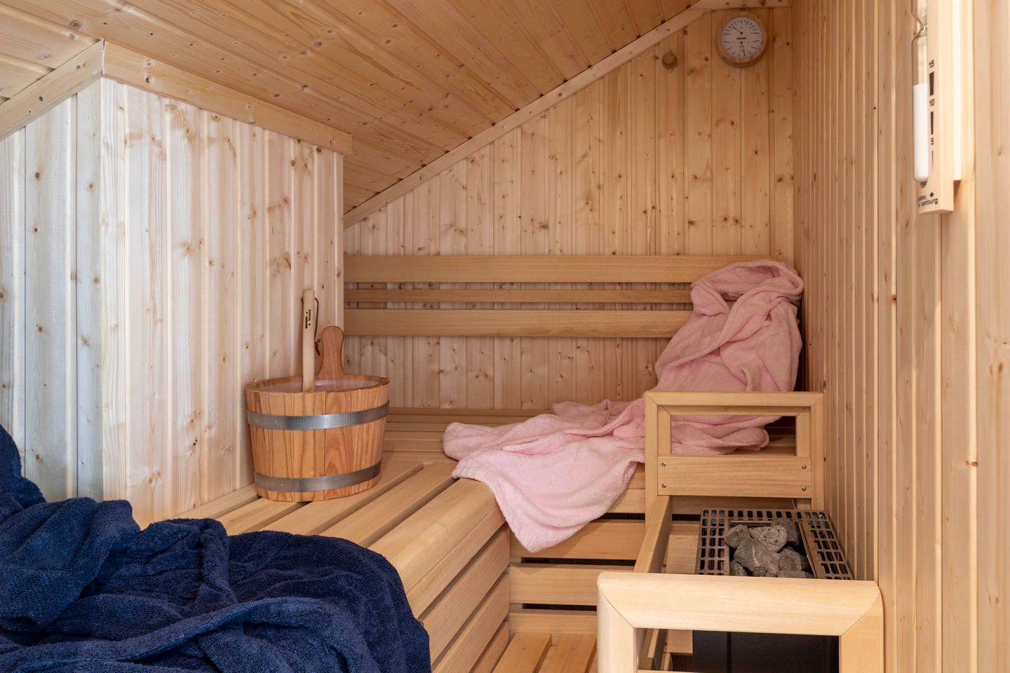 Sollte das Wetter mal nicht so richtig mitspielen, können Sie in der kleinen Sauna für zwei Personen schöne Stunden verbringen.