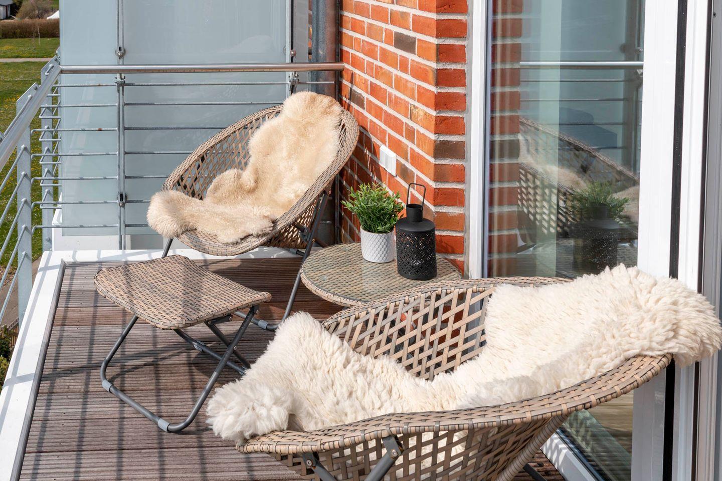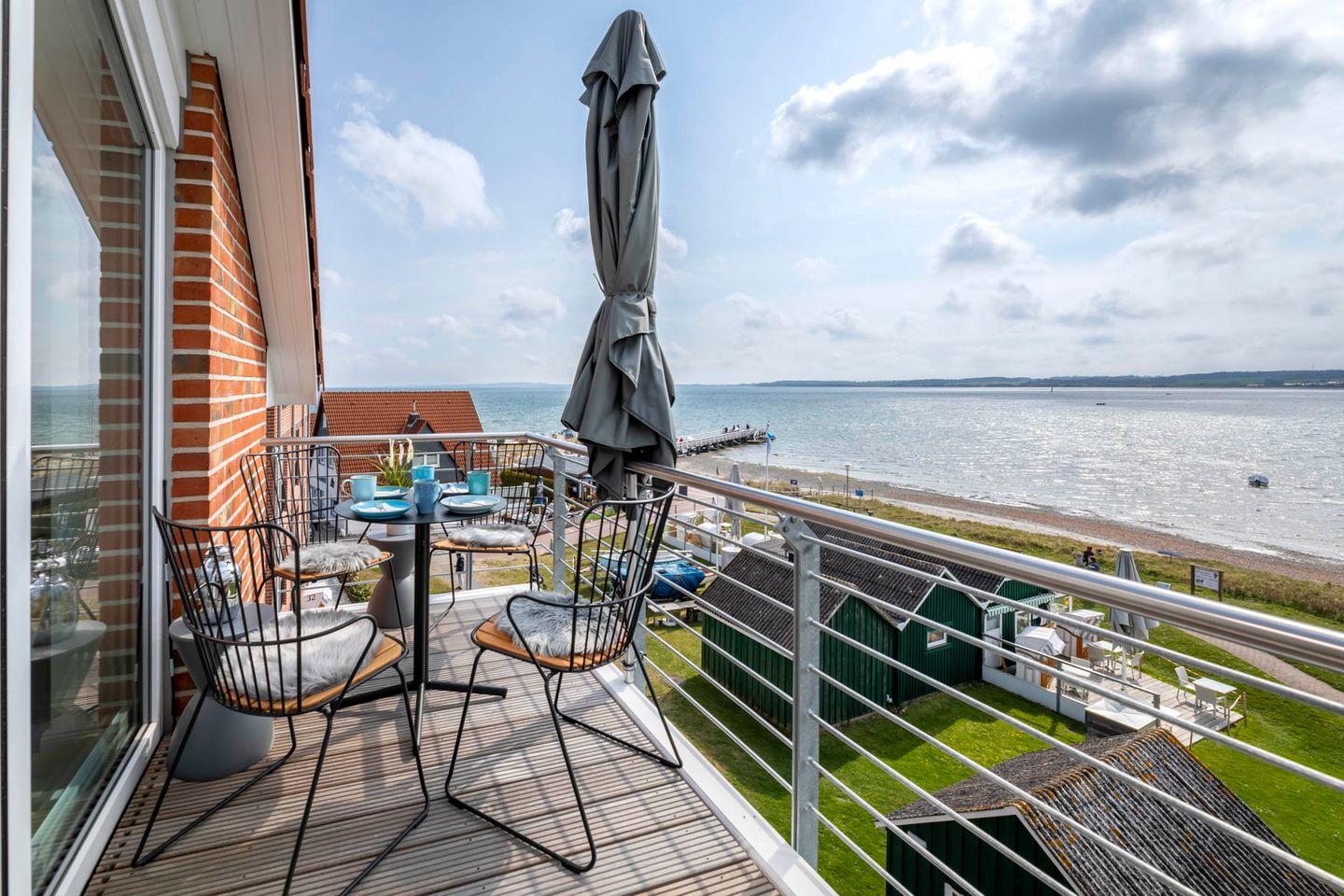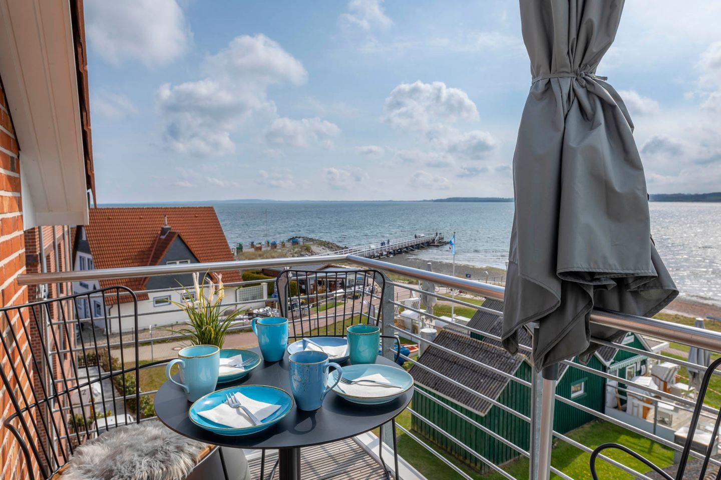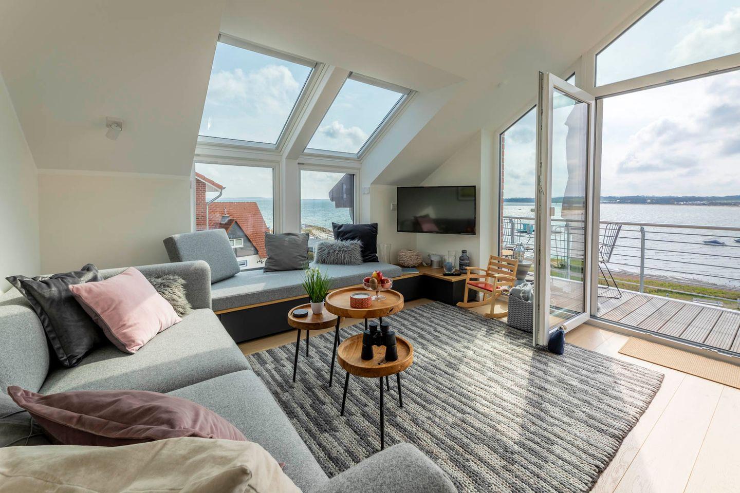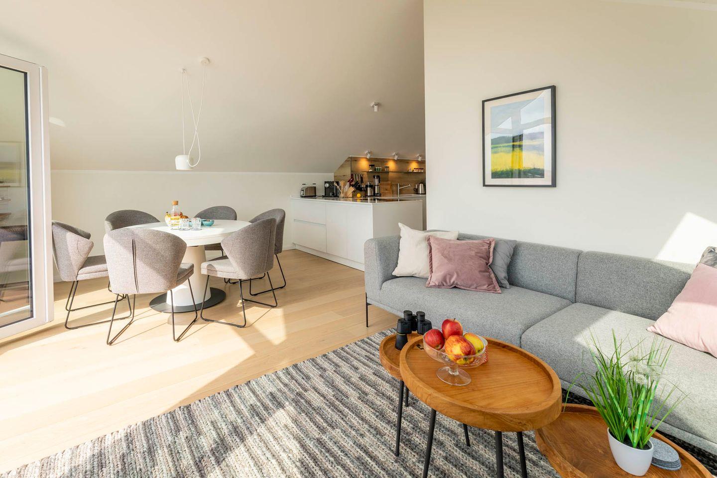 Der helle Wohnraum der Ferienwohnung "Meer" verfügt über zwei große Fensterfronten, die ebenso wie der große Balkon ein großartiges Panorama bieten. Im Wohnraum befinden sich das gemütliche Sofa und Esstisch, die nach einem langen Tag am Meer zum Entspannen einladen. Ein Fernseher sowie ein BOSE-Smart Speaker sorgen bei Bedarf für Unterhaltung.