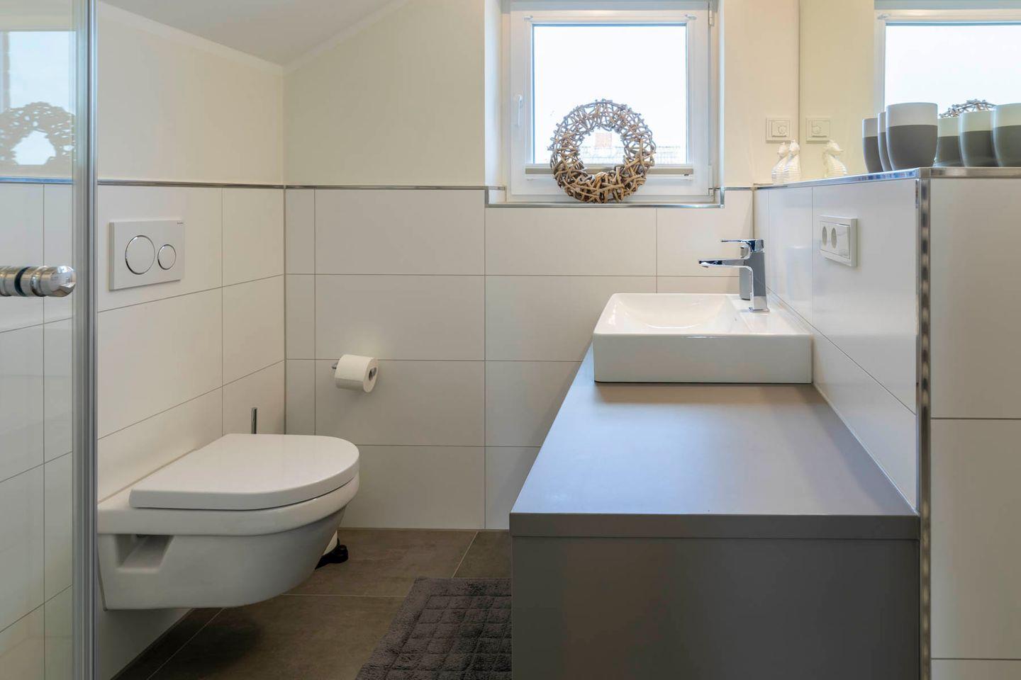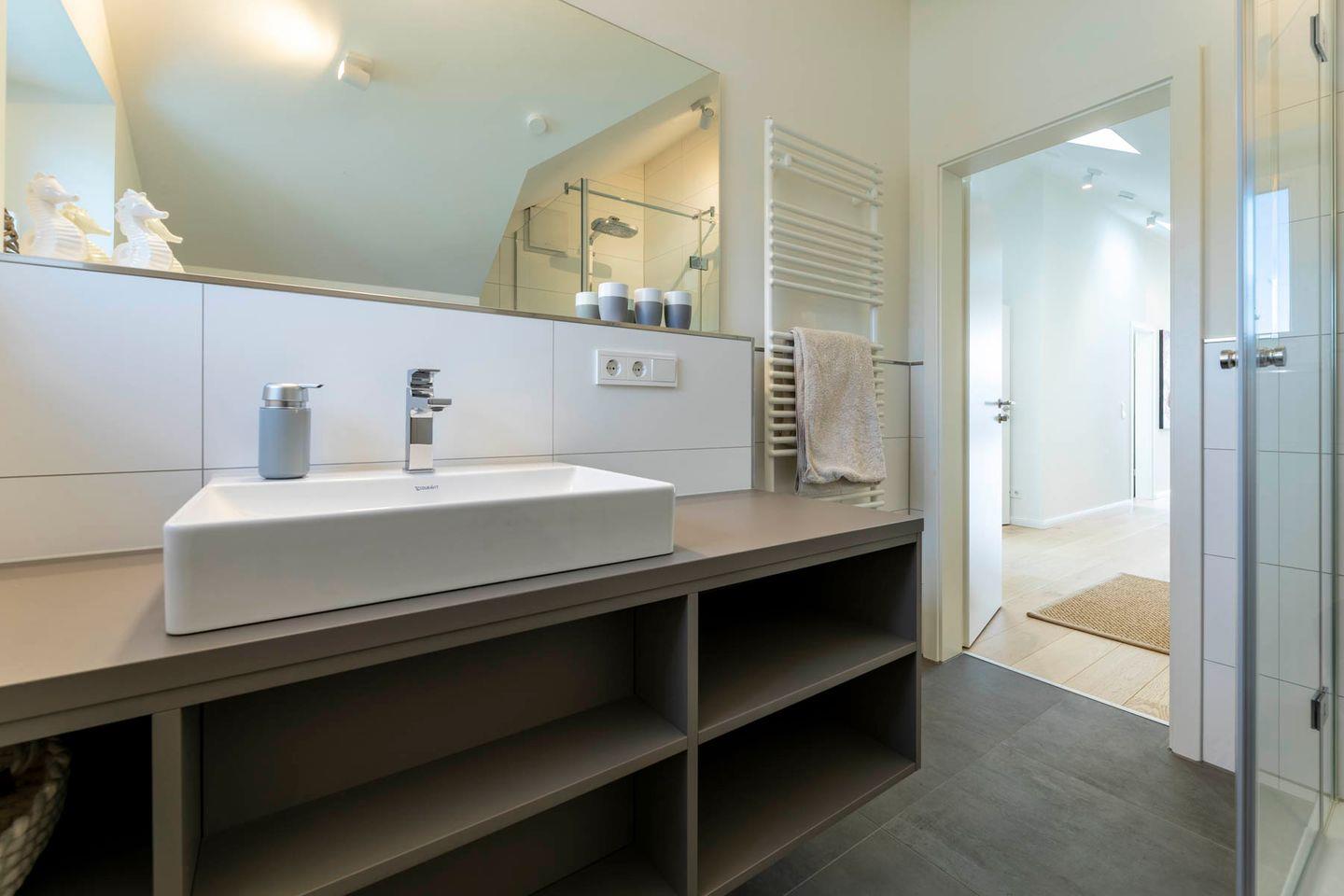 In der Wohnung stehen Ihnen zwei Badezimmer zur Verfügung. Das eine ist mit einer bodentiefen Dusche und das andere mit einer Badewanne mit Duschmöglichkeit ausgestattet. Helle Fliesen sorgen für einen modernen Gesamteindruck. Deckenspots, Waschtische mit großen Spiegeln sowie ein Fön sind hier ebenso vorhanden wie Handtuchwärmer.