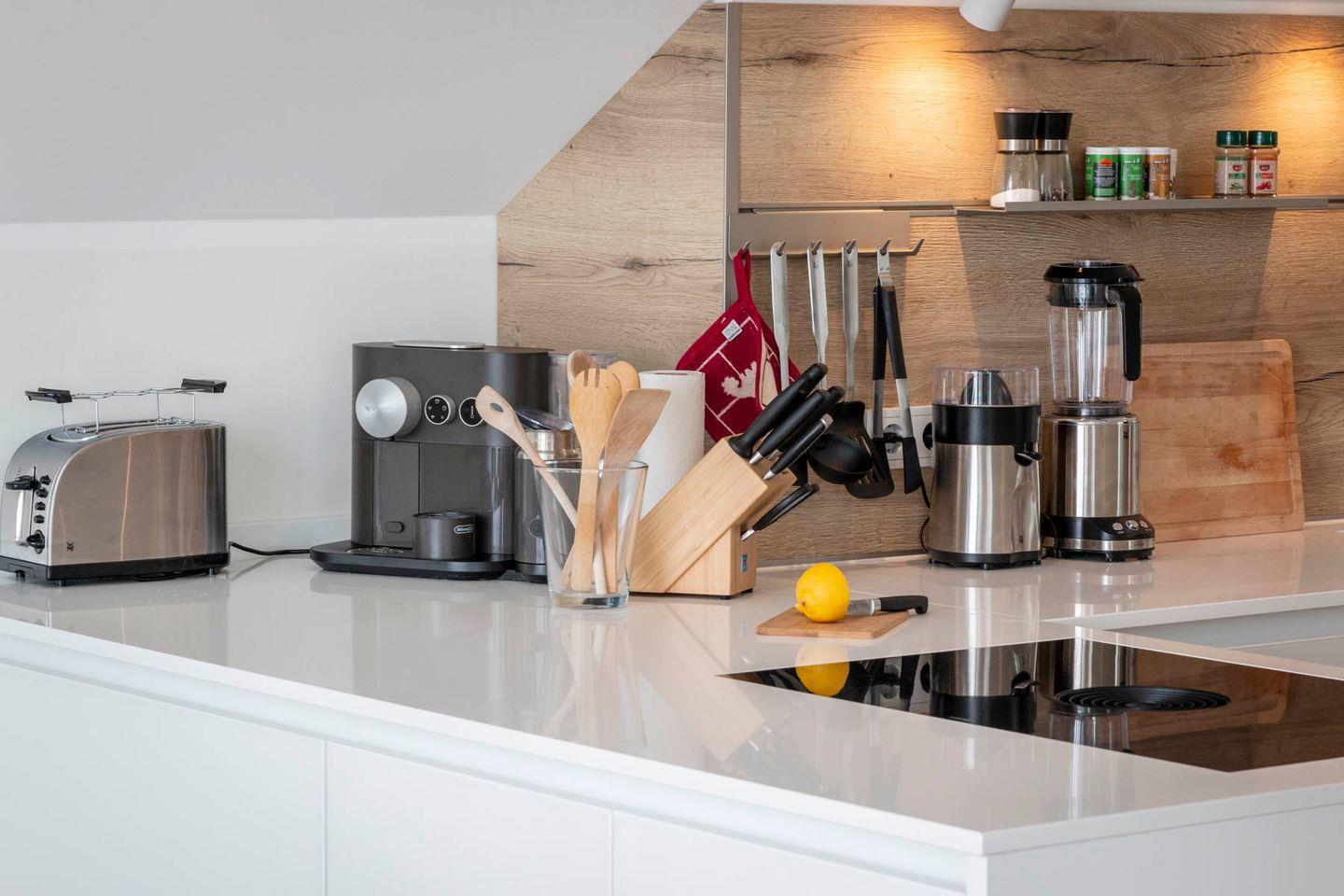 In den Wohnraum integriert sorgt die hochwertige, offene Küche mit Koch-Insel für eine moderne Raumaufteilung. Die Küche ist umfassend ausgestattet und bietet ausreichend Arbeitsfläche, um im Urlaub auch einmal anspruchsvoller zu kochen. Zu ihren Vorzügen gehören neben Induktionsherd und Backofen auch ein Kühlschrank (mit Gefriermöglichkeit), eine Kaffee- und eine Espressomaschine (Nespresso De'Longhi), Wasserkocher, Toaster sowie Spülmaschine.