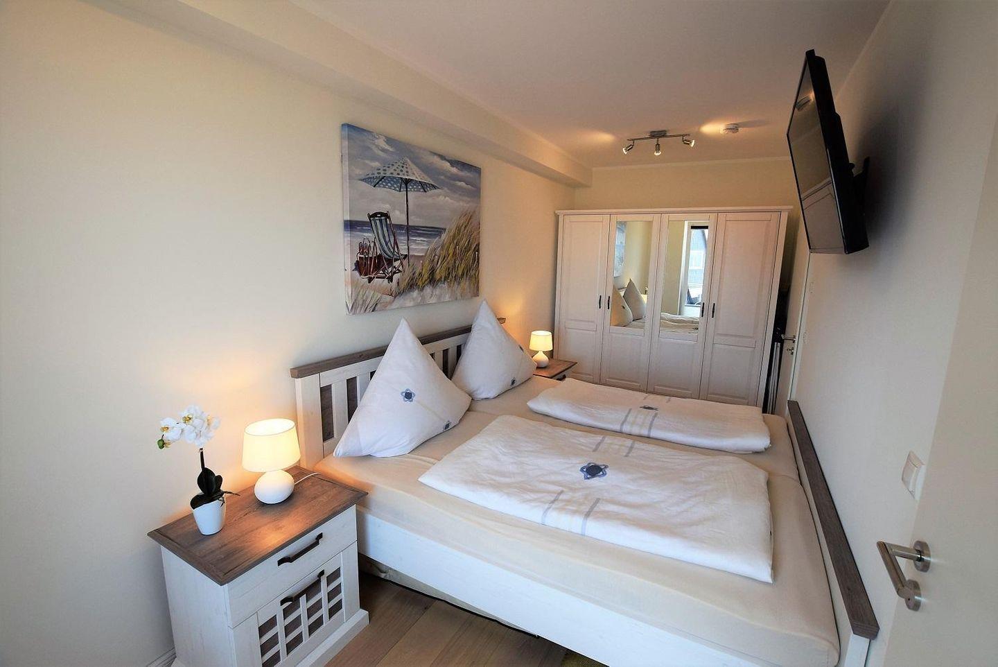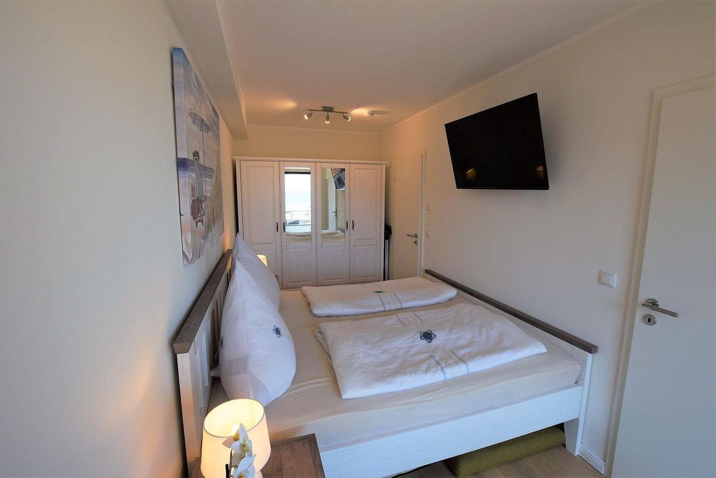 Das Schlafzimmer verfügt sowohl über einen geräumigen Kleiderschrank, als auch über ein großes Doppelbett. Durch bodentiefe Fenster wirkt der Raum lichtdurchflutet.