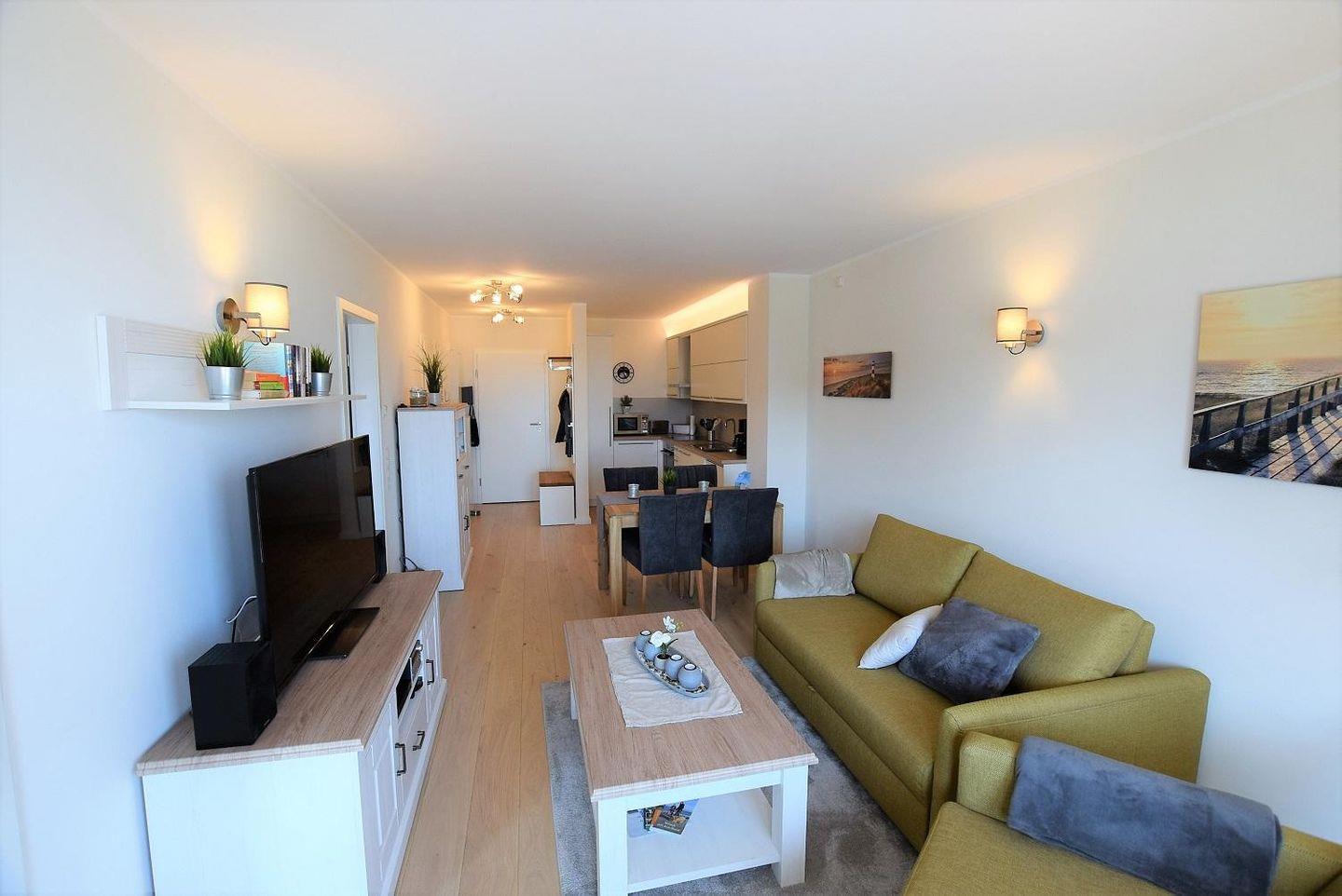 Das große Sofa, sowie zwei Flachbild-TV laden hier zum Verweilen ein. Das Sofa kann bei Bedarf ausgezogen werden und bietet Platz für bis zu zwei Gäste.