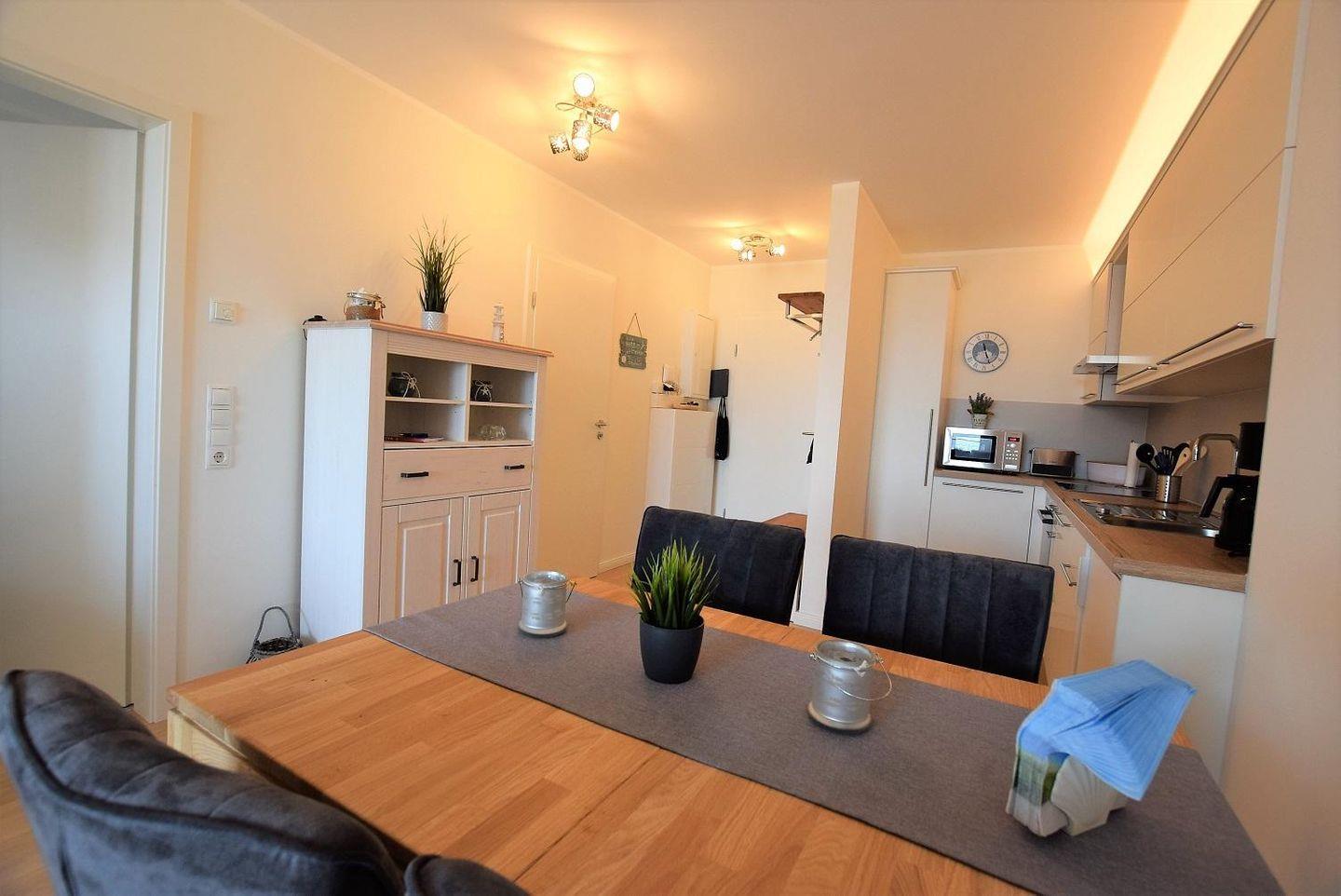 Der Essbereich mit Küche in L-Form verfügt zusätzlich über einen Essplatz mit Sitzplätzen für bis zu vier Personen. Die Küchenzeile ist modern und ansprechend. Zu den Ausstattungsdetails gehören hier eine Geschirrspülmaschine, der Herd mit Ceranfeld und Backofen, ein Kühlschrank inklusive Gefriermöglichkeit, und weitere Annehmlichkeiten.
