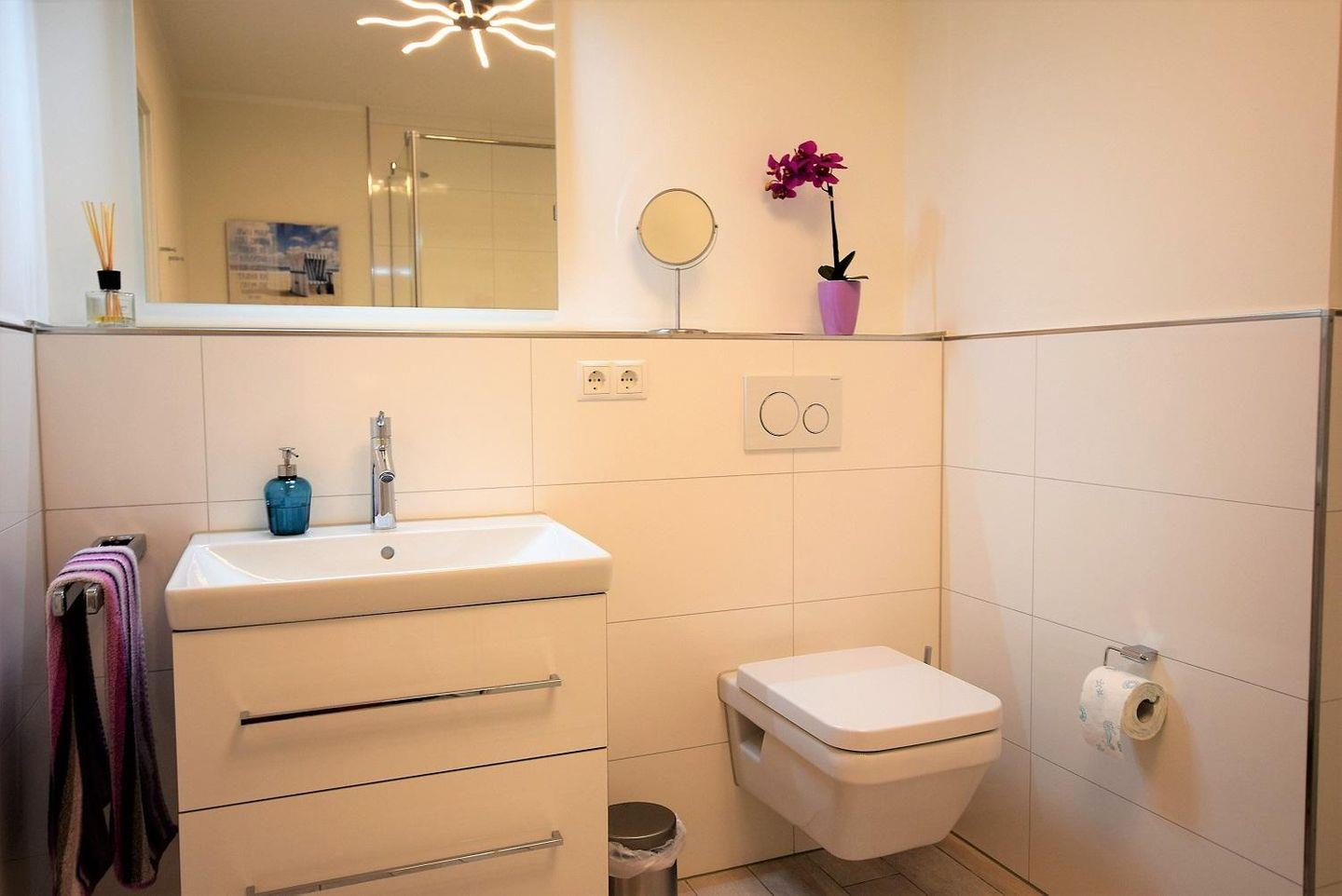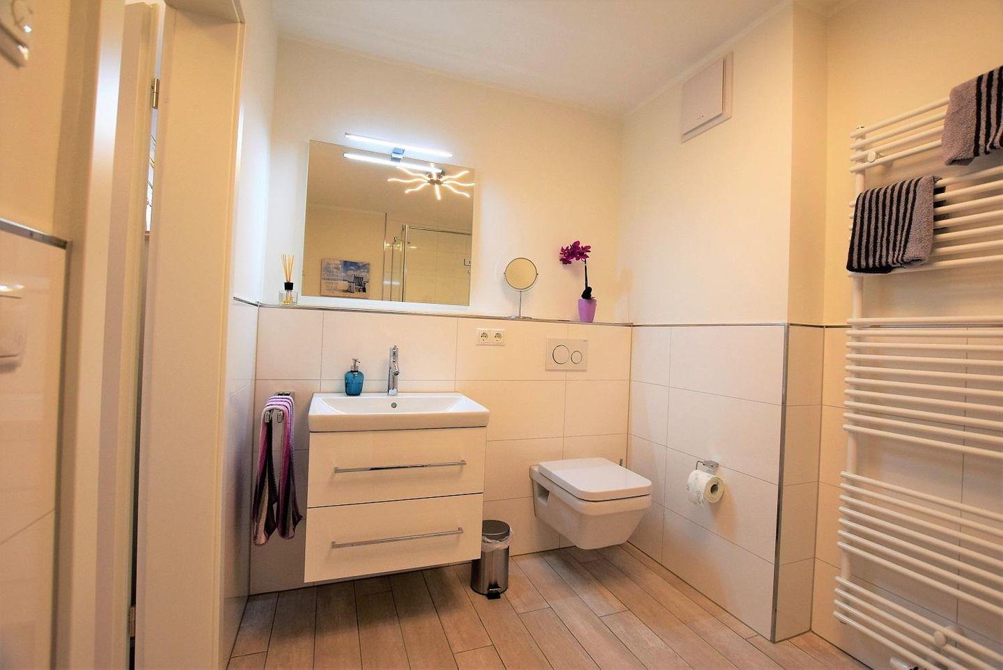Das Bad mit Dusche/ WC ist zusätzlich mit einem Waschtisch ausgestattet, welcher für viel Ablagefläche auch im Badezimmer sorgt. Deckenspots und ein Handtuchwärmer ergänzen die moderne Einrichtung.