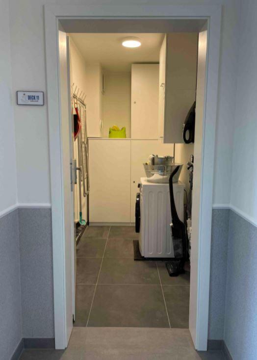 Ein zur Wohnung gehörender Hauswirtschaftsraum bietet zudem Fläche für einen Waschtrockner, Bügelbrett/-eisen, Ihren Koffer, Kinderwagen oder weitere Dinge. Dieser private Raum ist separat über den Hausflur erreichbar und lässt sich ebenfalls mit dem Wohnungsschlüssel bedienen.