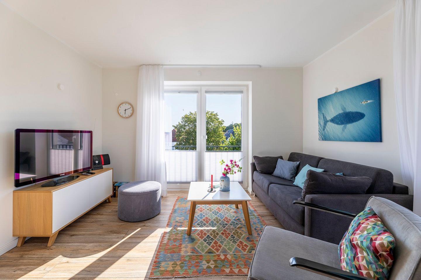 Der helle Wohnraum der Ferienwohnung "Große Freiheit" verfügt über eine große Fensterfront, hinter welcher sich der schöne Balkon der Wohnung erstreckt. Direkt davor befindet sich das gemütliche Sofa und ein Sessel, die nach einem langen Tag am Meer zum Entspannen einladen. Eine Fernseher runden den Wohnbereich ab.