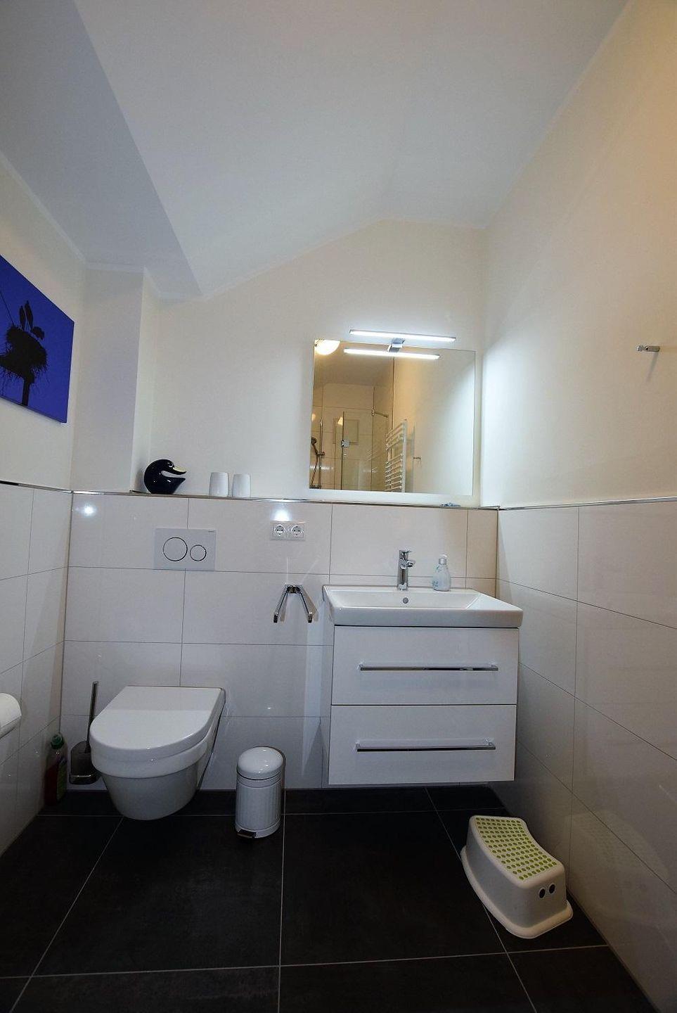 Das Duschbad lässt ebenfalls keine Wünsche offen. Die Dusche ist bodentief und lässt sich mit einer Glastür verschließen. Helle Fliesen sorgen für einen modernen Gesamteindruck. Deckenspots, ein Waschtisch mit großem Spiegel und ein Fön sind hier ebenso vorhanden wie ein Handtuchwärmer.
