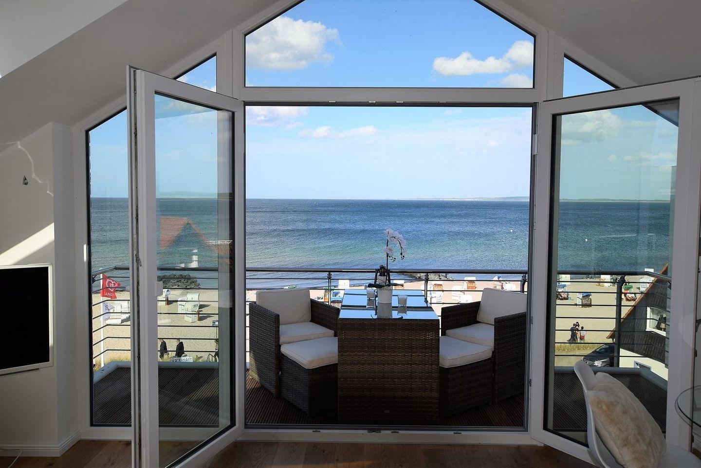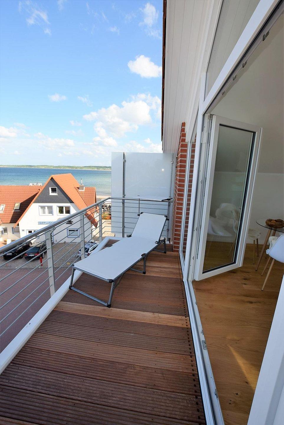Direkt vom Wohnraum aus kann der schöne Balkon der Wohnung betreten werden. Hier kann nicht nur die Aussicht auf die mal ruhige, mal schäumende See genossen werden, sondern auch ein fantastischer Panoramablick über die ganze Bucht. Durch seine Lage bietet der Außenbereich pünktlich zum Frühstück Sonne, die sich den ganzen Tag über hält.