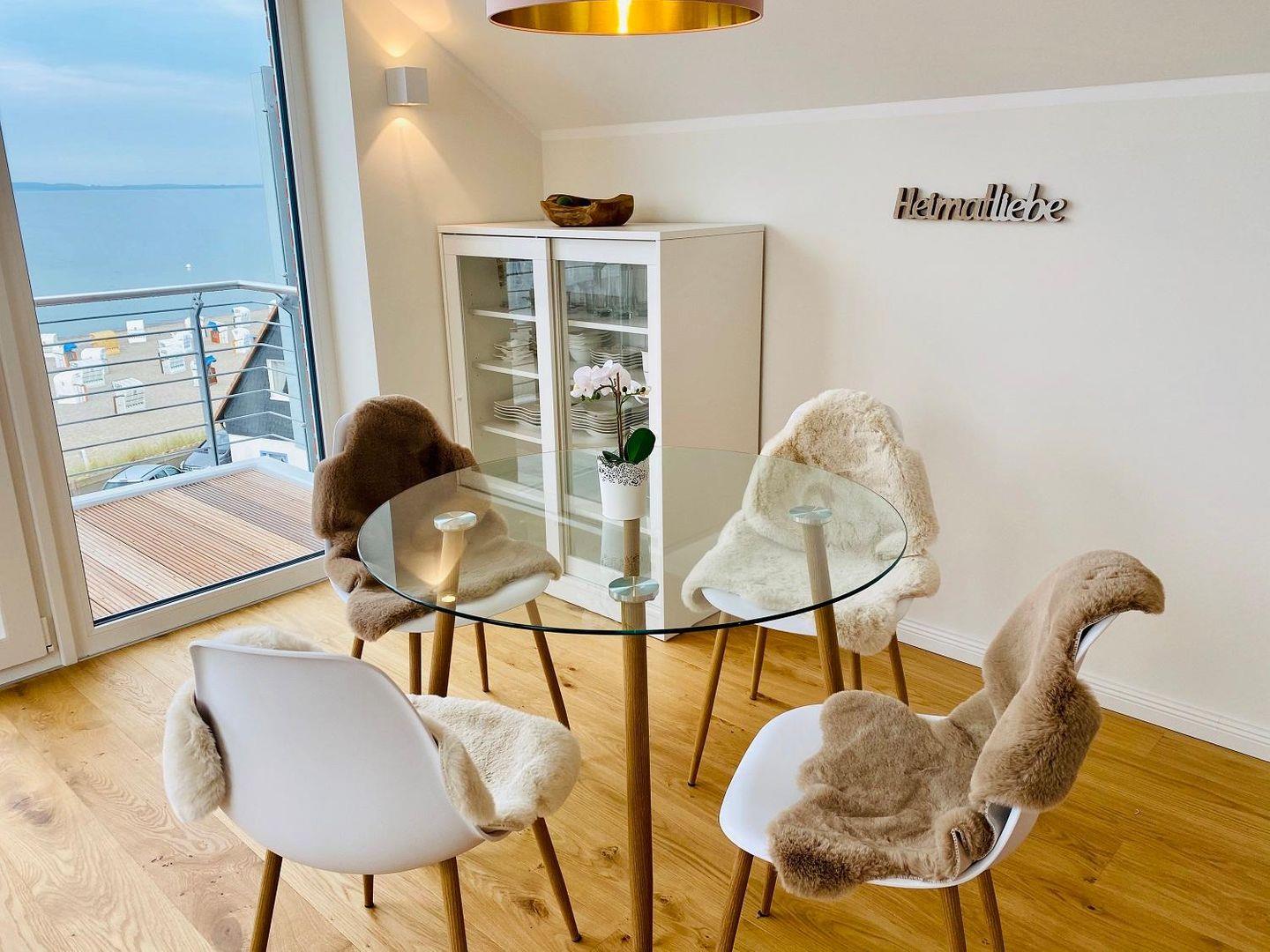 Der helle Wohnraum der Traumferienwohnung "Ostseesternchen" verfügt über eine große Fensterfront, hinter welcher sich der schöne Balkon der Wohnung erstreckt. Direkt davor befindet sich das gemütliche Sofa und Esstisch, die nach einem langen Tag am Meer zum Entspannen einladen. Ein großer Fernseher sorgt für Unterhaltung wenn gewünscht.