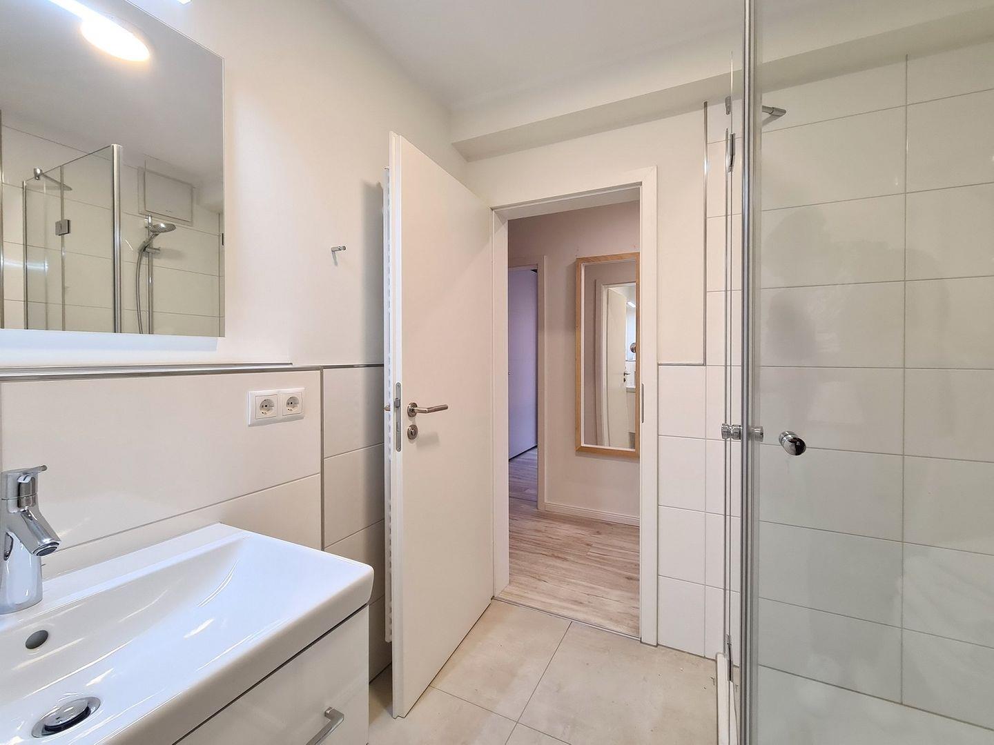 Das Bad mit Dusche/WC ist mit einem Waschbecken ausgestattet, welches darunter ausreichend Stauraum bietet. Der Spiegel sowie der Stand-Kosmetikspiegel mit Beleuchtung harmoniert mit der modernen und sauberen Ausstattung des Sanitärbereiches, sodass es ein ästhetisches Gesamtbild abgibt.