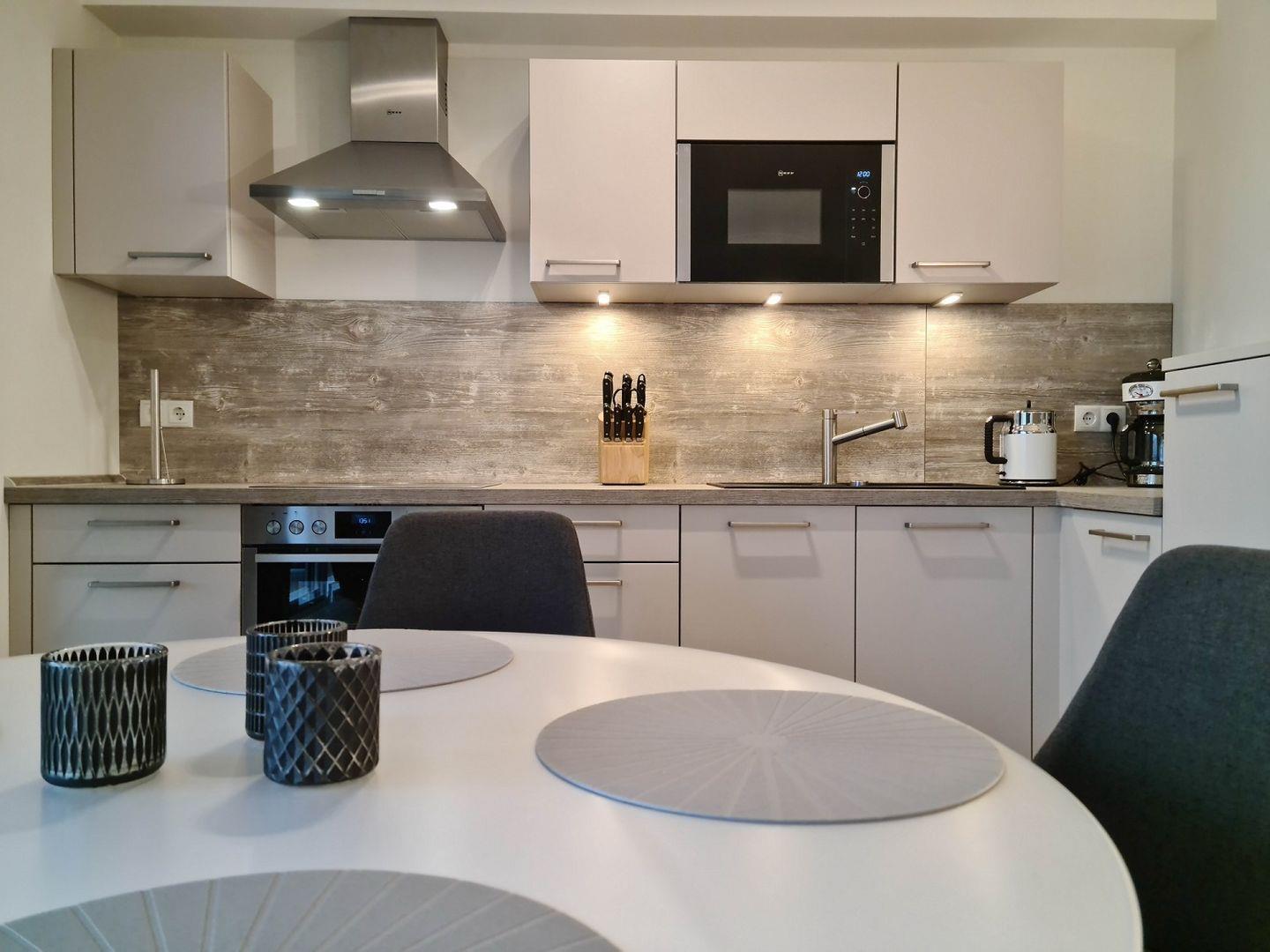 Der moderne Essbereich, der Platz für bis zu vier Personen bietet, grenzt an die geschmackvolle und vor allem formvollendete Küche. Auch hier findet man sämtliche Ausstattungsdetails. Eine Geschirrspülmaschine, ein Herd mit Induktionskochfeld und Backofen, ein Kühlschrank mit Gefriermöglichkeit bieten nebst weiteren Geräten eine sehr gute Ausstattung.