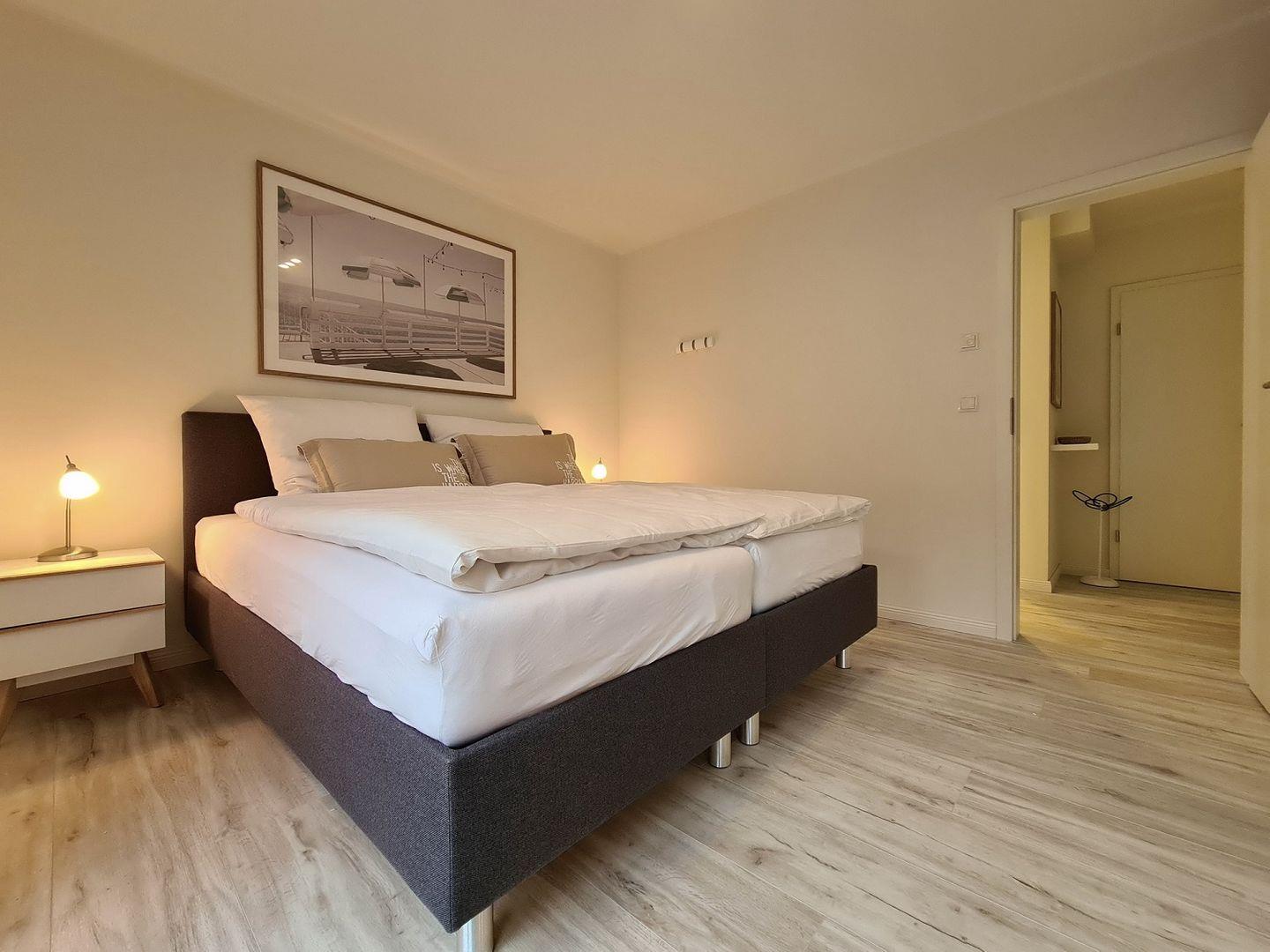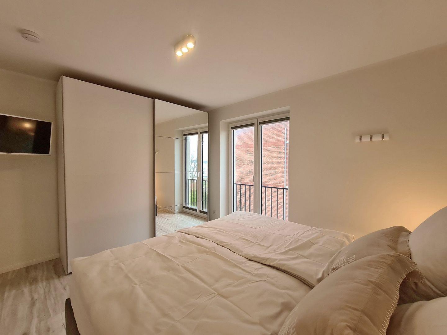 Die großen sowie bodentiefen Fenster im Schlafzimmer ermöglichen viel Tageslicht. Durchaus besteht die Möglichkeit die Fenster zu verdunkeln. Das Boxspringbett (180x200) bietet neben dem großen und geräumigen Kleiderschrank viel Komfort.