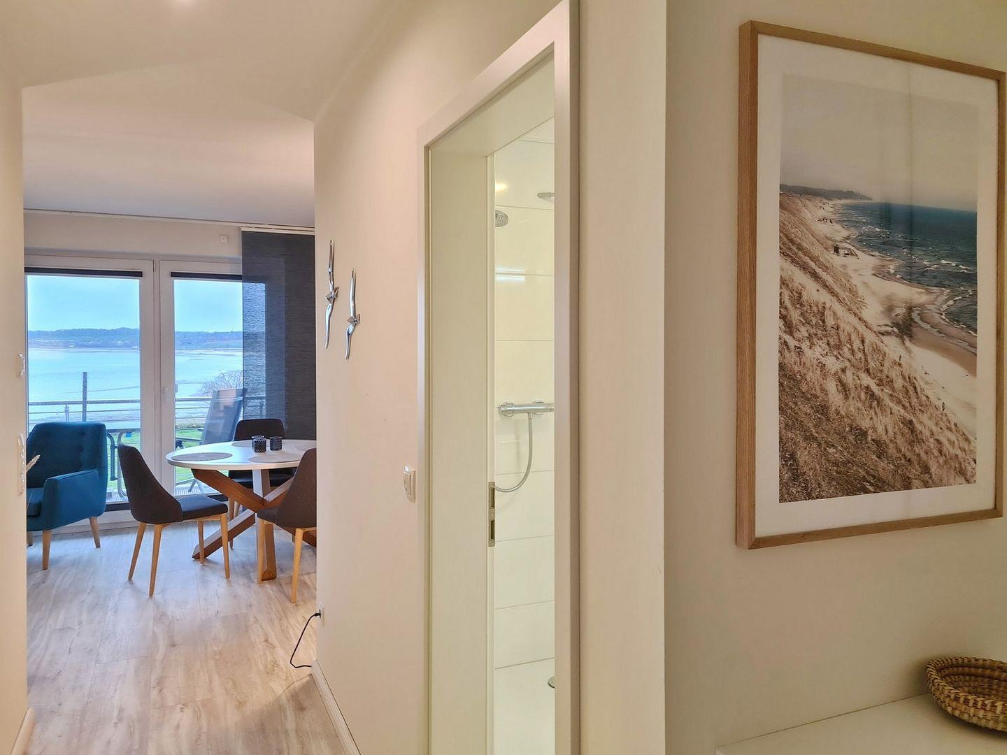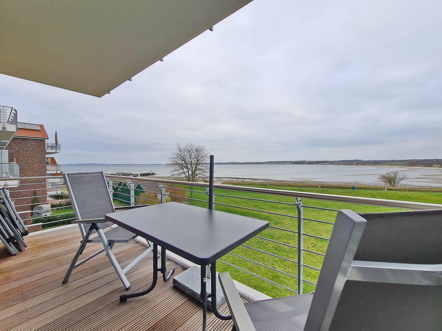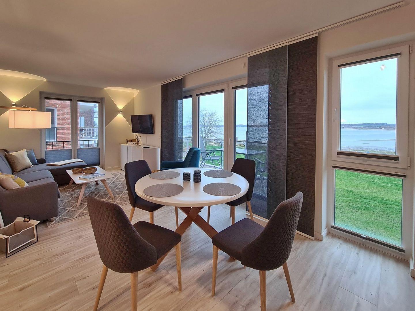 Von dem Wohnzimmer, welches mit innovativen und modern designten Lichtern erstrahlt, führen die großen Türen aus Glas auf den Balkon mit einzigartigen Ausblick auf die Hohwachter Bucht. Mit Leichtigkeit kann man das Naturschutzgebiet Sehlendorfer Binnensee, sowie die Schönheit der Ostsee erblicken.