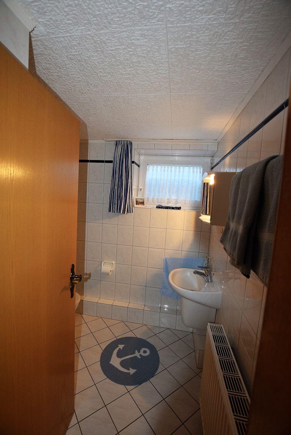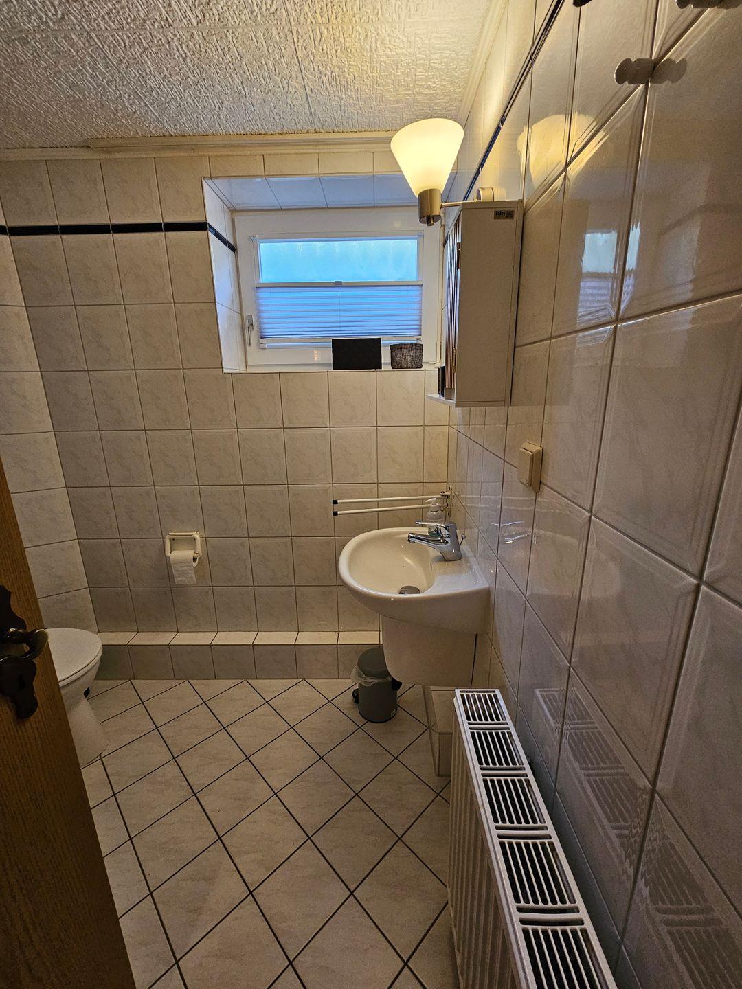 Das geräumige Badezimmer mit Waschbecken, Dusche und WC rundet die Ausstattung ab.