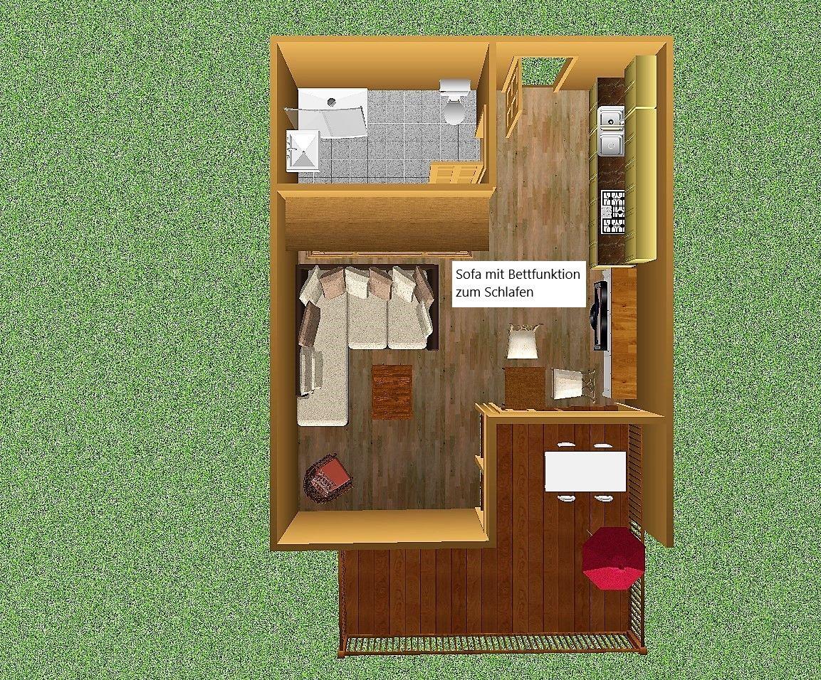 Das bequeme Sofa im Wohnraum wird zum Schlafen ausgeklappt, durch eine komfortabel Bettfunktion stehen erholsame Nächten nicht im weg. Das Bettzeug können Sie Tagsüber im großen Einbauschrank verstauen.
