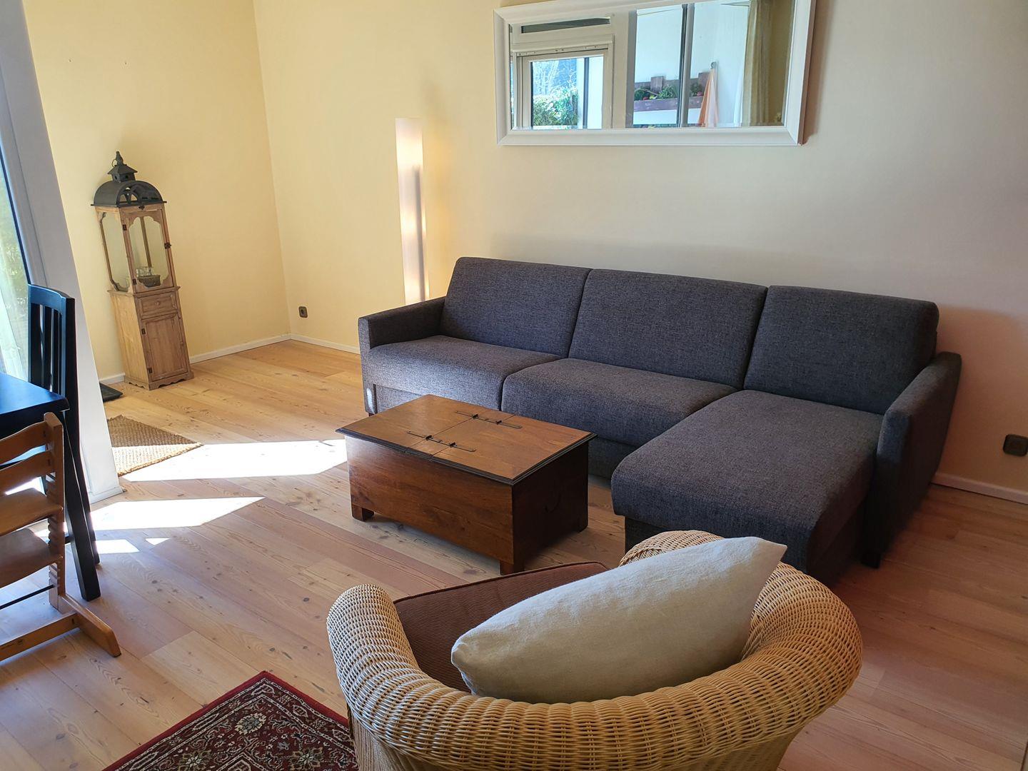 Dabei befindet sich die Küche im hinteren Teil des Raumes, das große bodentiefe Fenster und die Terrassentür öffnen sich zu einer großzügigen Terrasse, auf der gemütlich gefrühstückt oder in der Sonne verweilt werden kann. Gartenmöbel und Sonnenschirm sind für Sie bereitgestellt.