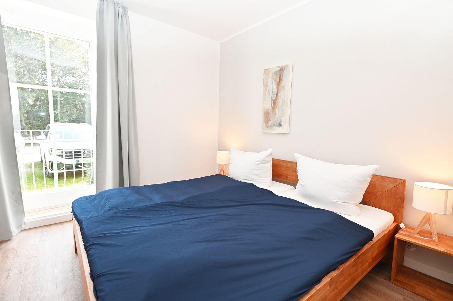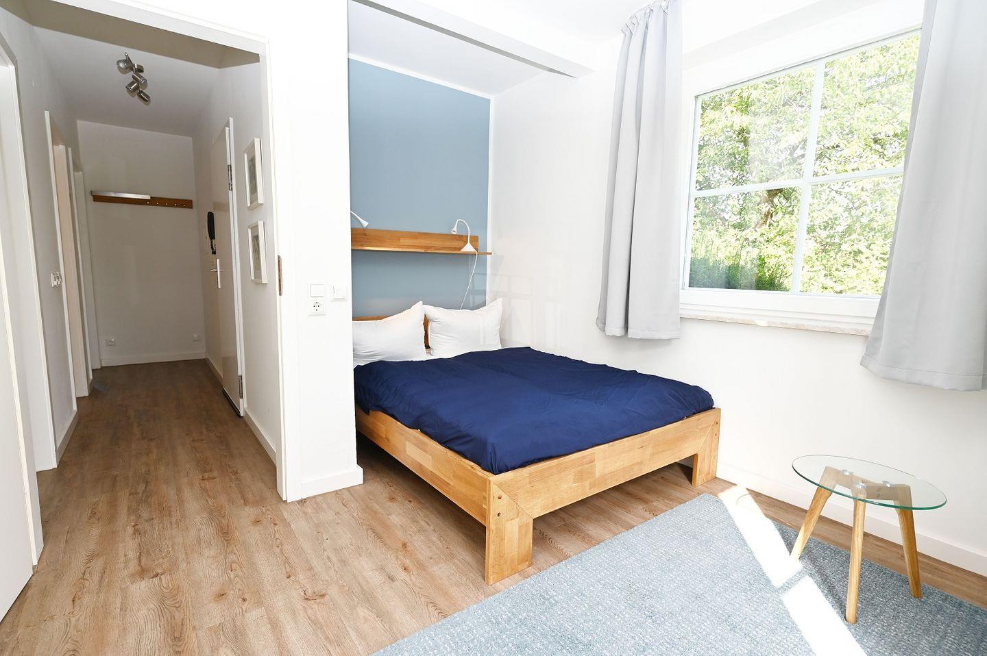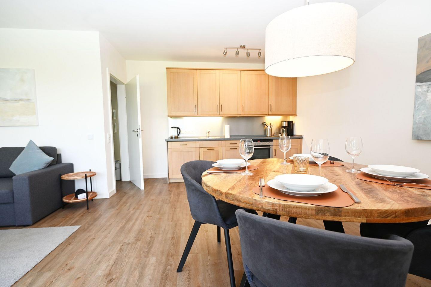 Die 3-Zimmer Ferienwohnung ist für 4 Personen ausgelegt. Sie besteht aus einem offenen Wohn- Essbereich mit integrierter Küche, welche z. B. über Geschirrspülmaschine, Dolce-Gusto-Maschine (Kaffee, Espresso, Kakao) und weiteres verfügt. Der Wohnbereich lädt durch die gemütliche Sofaecke auch an Abendstunden zum Verweilen ein. In beiden Schlafzimmern finden Sie jeweils ein Doppelbett mit geräumigem Kleiderschrank und Nachttischlampen vor, die Fenster können verdunkelt werden. Das Badezimmer mit einem großen Spiegel, Föhn, WC und ebenerdiger Regendusche runden die Ausstattung ab. In den großen Schubladen unter dem Waschbecken finden Sie viel Stauraum für Kosmetik- und Pflegeprodukte.