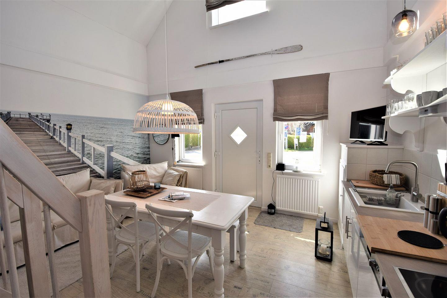 Der gemütliche Wohnbereich lädt mit Relaxmöbeln, Kissen, Kerzen und Kuscheldecken sowie einem TV und einem dänischen Kaminofen zum Verweilen ein. Der große Wohn- und Essbereich mit offener Küche ist voll ausgestattet mit allem, was Sie für einen entspannten Urlaub benötigen. Hier finden Sie eine Kaffeemaschine, Espressomaschine, Backofen, Herd, Kühlschrank mit Gefrierfach und vieles mehr. Hier können Sie sich kulinarisch verwöhnen und Ihrer Kreativität in der Küche freien Lauf lassen.