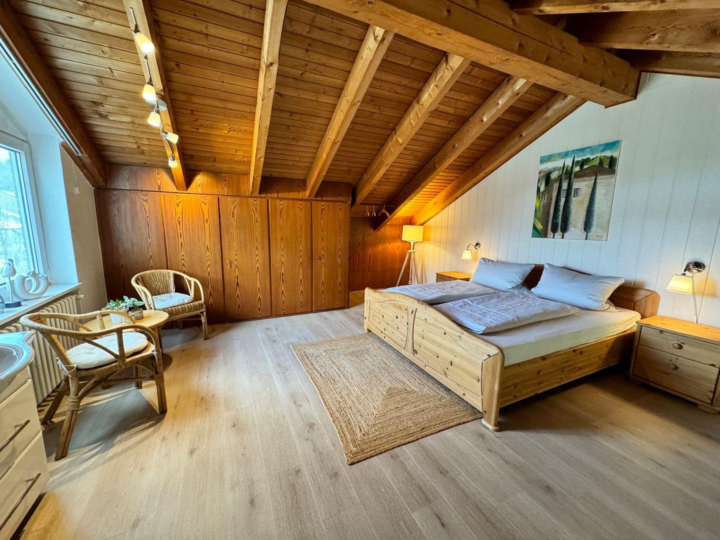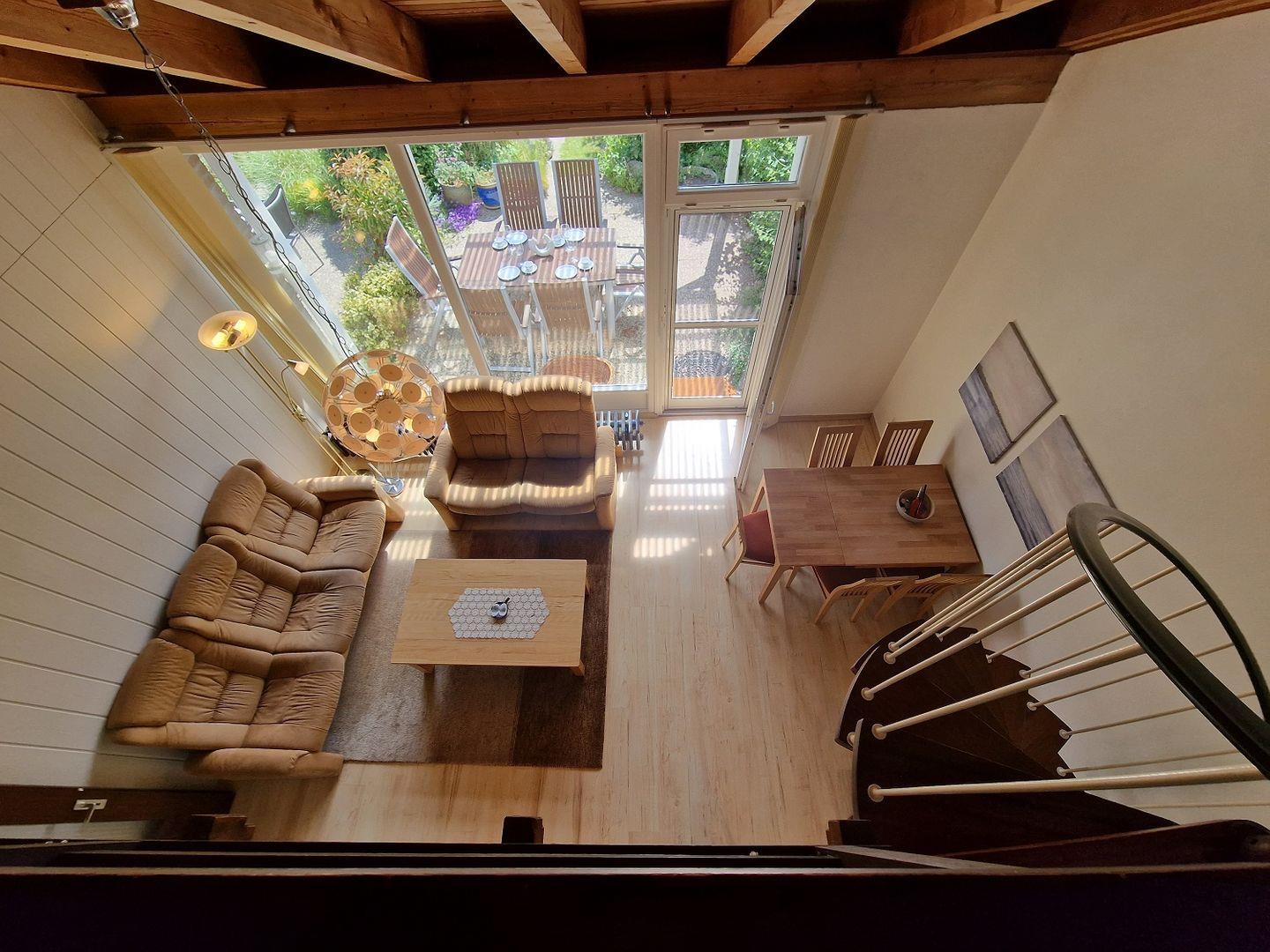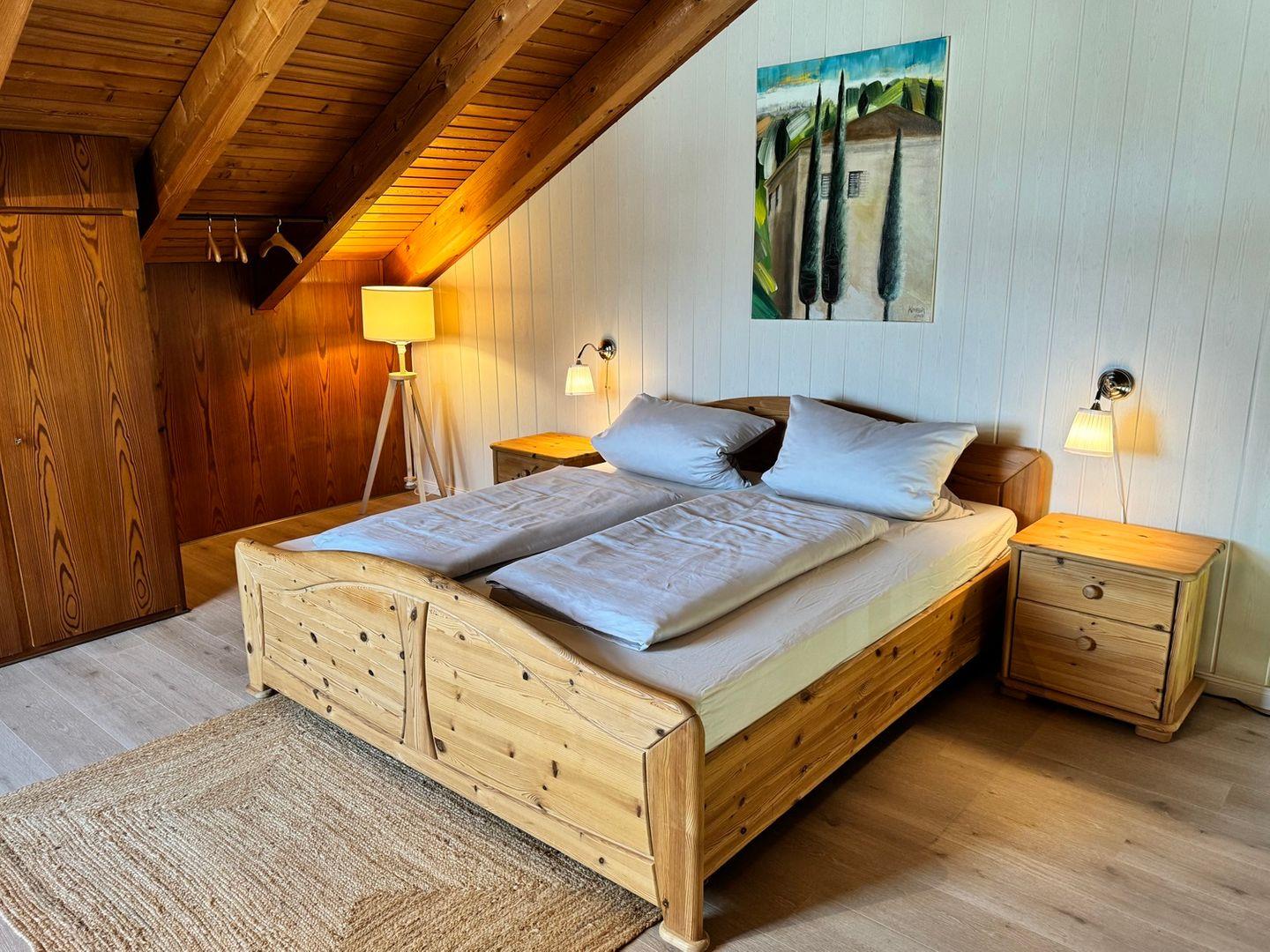 Die Wohnung verfügt über zwei Schlafzimmer, die für eine optimale Privatsphäre sorgen. Das erste Schlafzimmer ist über eine ansprechende Wendeltreppe vom Wohnbereich aus zugänglich. Hier erwartet Sie ein gemütliches Doppelbett, das für erholsame Nächte nach einem erlebnisreichen Tag sorgt. Im zweiten Schlafzimmer im Erdgeschoss befinden sich zwei Einzelbetten, perfekt für Kinder oder Freunde. Beide Schlafzimmer bieten reichlich Stauraum für Kleidung und persönliche Gegenstände.