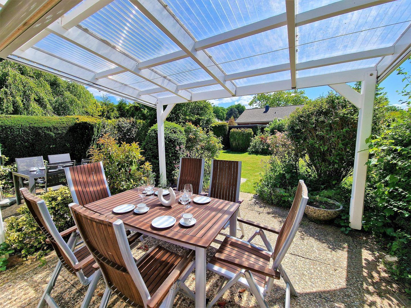 Von der Wohnung aus gelangen Sie auf eine schöne überdachte Terrasse mit Glasdach und Markiese zur Beschattung. Tolle Sitzgelegenheiten, auf denen Sie die frische Ostseeluft genießen und die Ruhe der Umgebung erleben können. Der Gemeinschaftsgarten ist wunderschön angelegt und bietet eine grüne Oase, in der Sie sich entspannen und die Natur genießen können.