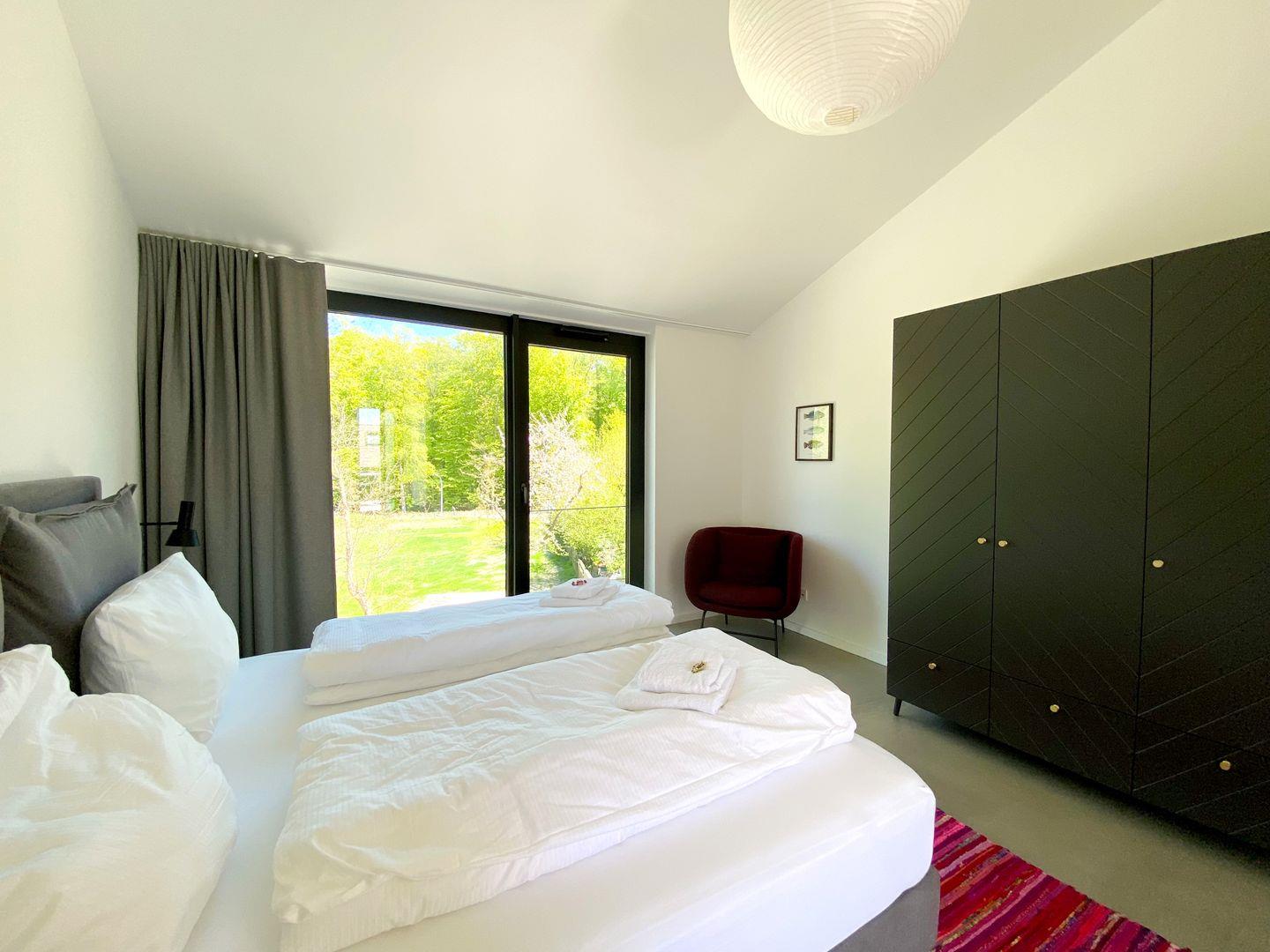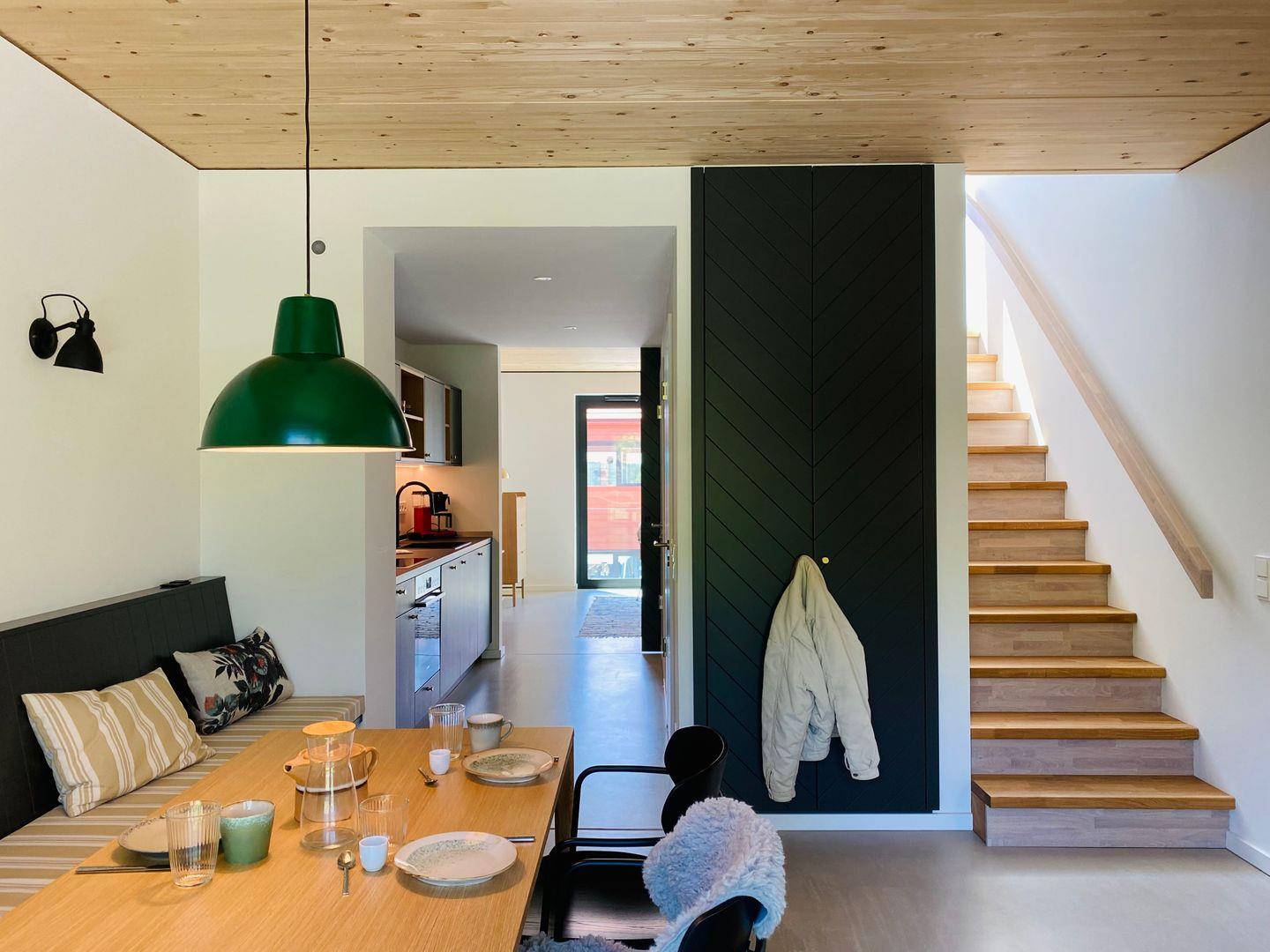 De ole School - nachhaltige Ferienwohnung mit Hygge-Feeling an der Ostsee. Zwei Geschosse mit Dachterrasse sorgen in dieser stilvollen Maisonette-Ferienwohnung für viel Freiraum. Ein separater Wohnbereich, der auch als Schlafzimmer genutzt werden kann, und ein extra Gäste-WC machen diesen Wohnungstyp besonders vielseitig und komfortabel. In der oberen Etage befinden sich ein Schlafzimmer mit einem Doppelbett, die Dachterrasse und ein schickes Badezimmer mit Dusche und WC. Der Wohn- und Essbereich, der durch eine Schiebetür abgetrennt ist, die offene Küche, das Gäste-WC und eine Abstellkammer mit Waschmaschine befinden sich in der unteren Etage. Die Ferienwohnung hat kostenloses schnelles WLAN, einen Smart-TV, eine komplette Küchenausstattung und eine Dachterrasse mit Weitblick aufs Quartier und die Felder. Ein intelligentes Schließsystem mit PIN-Code macht den Check-In flexibel. Jedes Apartment verfügt außerdem über zusätzlichen Stauraum im Keller (inkl. Fahrradkeller).