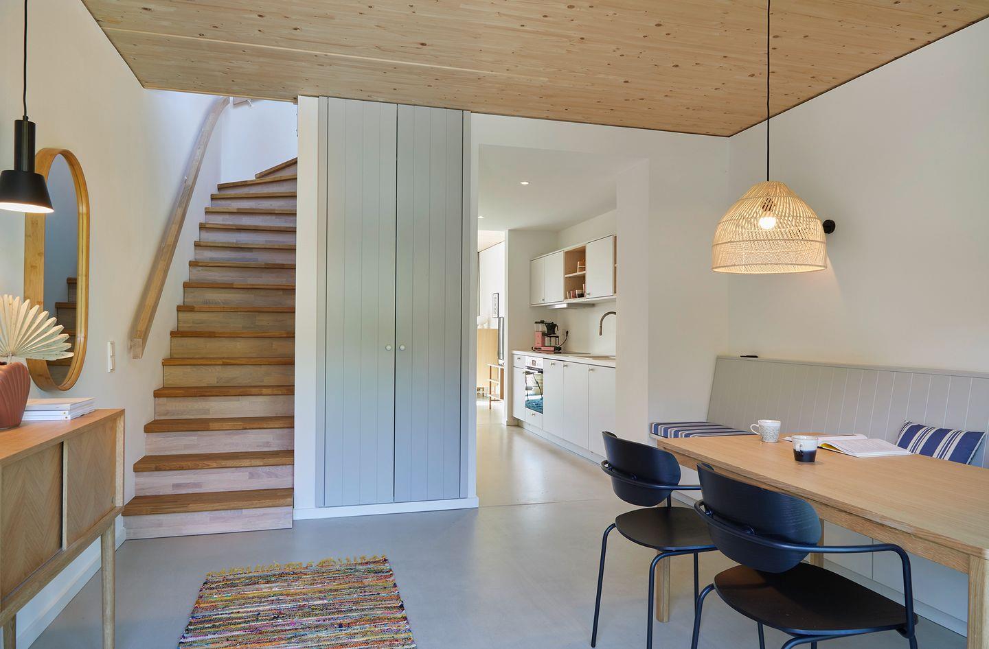 De ole School - nachhaltige Ferienwohnung mit Hygge-Feeling an der Ostsee. Zwei Geschosse mit Dachterrasse sorgen in dieser stilvollen Maisonette-Ferienwohnung für viel Freiraum. Ein separater Wohnbereich, der auch als Schlafzimmer genutzt werden kann, und ein extra Gäste-WC machen diesen Wohnungstyp besonders vielseitig und komfortabel. In der oberen Etage befinden sich ein Schlafzimmer mit einem Doppelbett, die Dachterrasse und ein schickes Badezimmer mit Dusche und WC. Der Wohn- und Essbereich, der durch eine Schiebetür abgetrennt ist, die offene Küche, das Gäste-WC und eine Abstellkammer mit Waschmaschine befinden sich in der unteren Etage. Die Ferienwohnung hat kostenloses schnelles WLAN, einen Smart-TV, eine komplette Küchenausstattung und eine Dachterrasse mit Weitblick aufs Quartier und die Felder. Ein intelligentes Schließsystem mit PIN-Code macht den Check-In flexibel. Jedes Apartment verfügt außerdem über zusätzlichen Stauraum im Keller (inkl. Fahrradkeller).