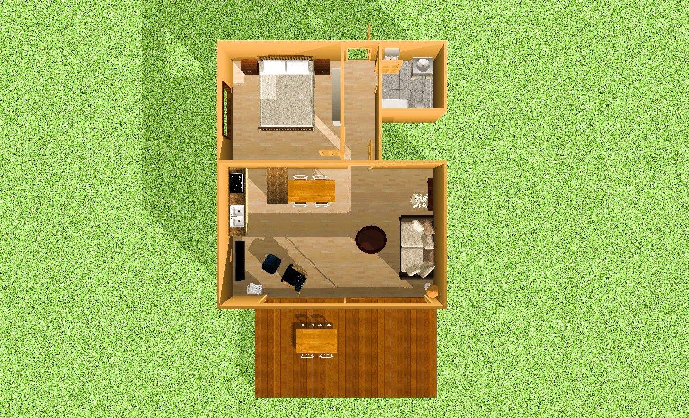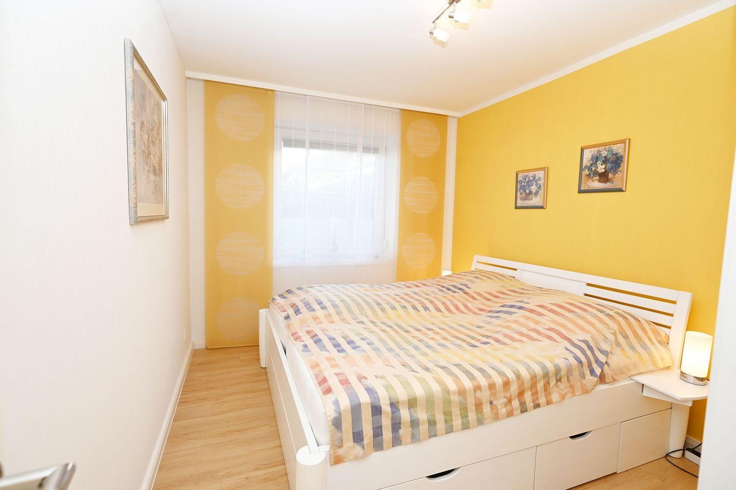Das Schlafzimmer empfängt Sie mit einem großzügigen Doppelbett, dessen offenes Fußende viel Komfort bietet. Zudem ist das Bett erhöht, was den Ein- und Ausstieg wesentlich erleichtert. Die geschmackvolle Einrichtung schafft eine behagliche Atmosphäre für erholsame Nächte.