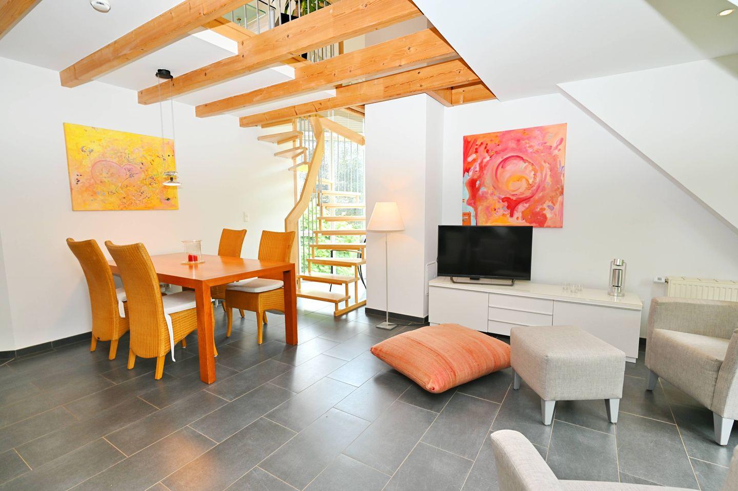 Die Ferienwohnung verfügt über zwei gemütliche Schlafzimmer, einmal im offenem Loftbereich mit Doppelbett sowie ein geschlossenes Schlafzimmer mit 2 Einzelbetten ( nur für Kinder geignet) am angrenzenden Wohnbereich – ideal für Familien, die gemeinsam Zeit verbringen möchten. Diese beiden Zimmer sind mit komfortablen Betten eingerichtet, sodass Sie nach einem ereignisreichen Tag am Strand erholsamen Schlaf finden können. Neben dem Schlafbereich gibt es einen lichtdurchfluteten Wohnbereich, der durch seine offene Gestaltung zum Verweilen einlädt. Hier können Sie die Zeit mit Ihren Liebsten verbringen, beim Fernsehen entspannen oder einfach die gesellige Atmosphäre genießen.