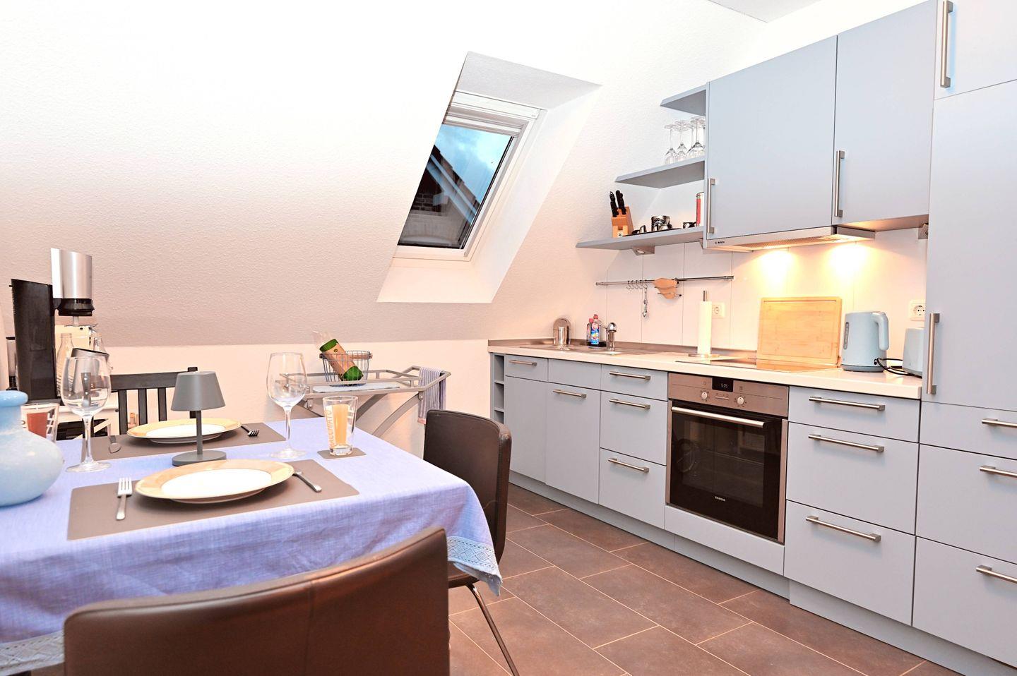 Die offene Einbauküche schließt sich direkt an den Wohnbereich an und ist umfangreich ausgestattet: Backofen, Cerankochfeld, Geschirrspülmaschine, Kühlschrank mit Gefrierfach, Nespresso-Espressomaschine, Kaffeemaschine, Toaster, Wasserkocher sowie Küchenutensilien, Geschirr und Besteck sind vorhanden. Die Zentralheizung sorgt zu jeder Jahreszeit für Behaglichkeit. Die Ferienwohnung ist eine Nichtraucherunterkunft.