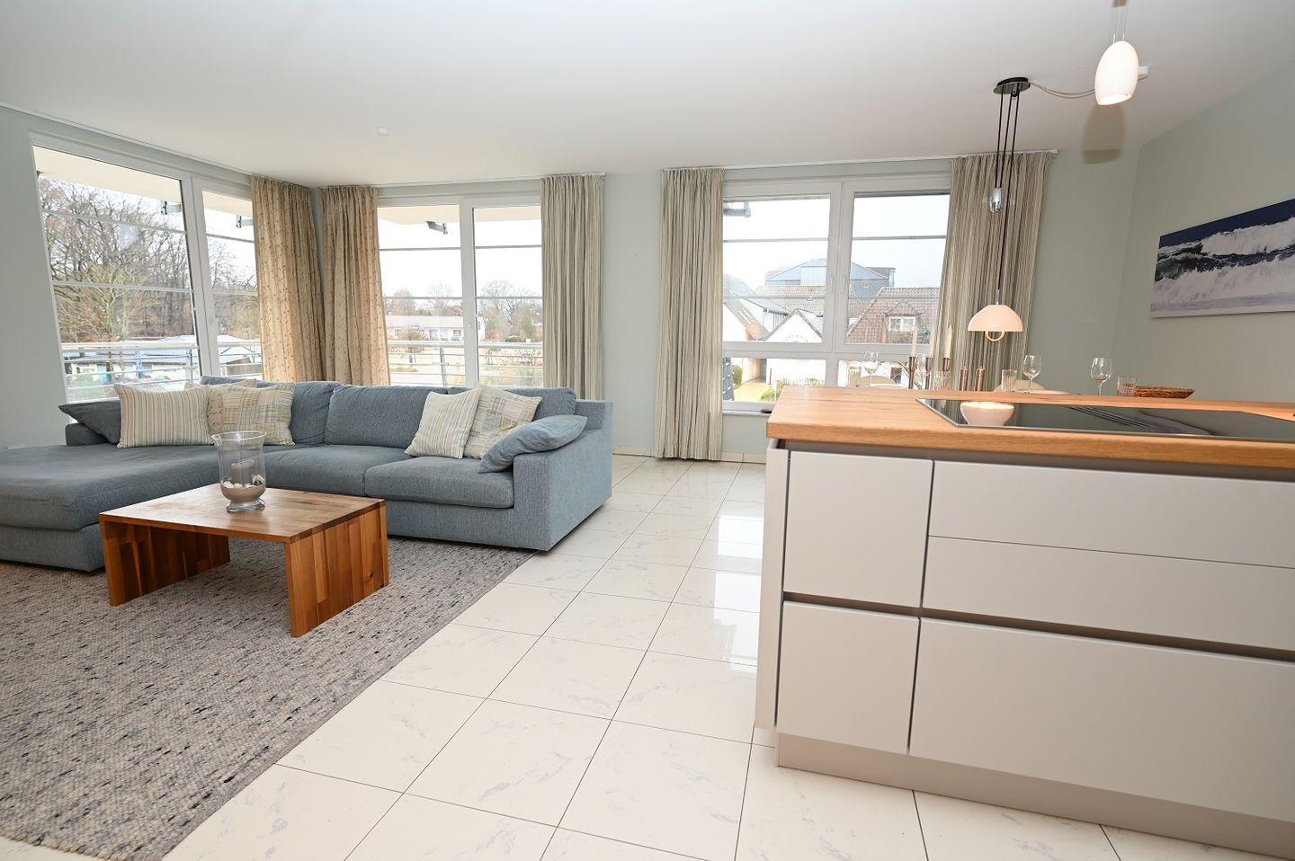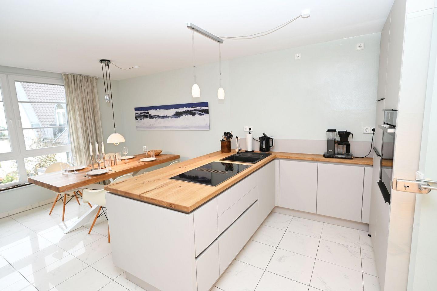Die moderne offene Küchenzeile lädt ein zum gemeinsamen Kochen und Klönen.