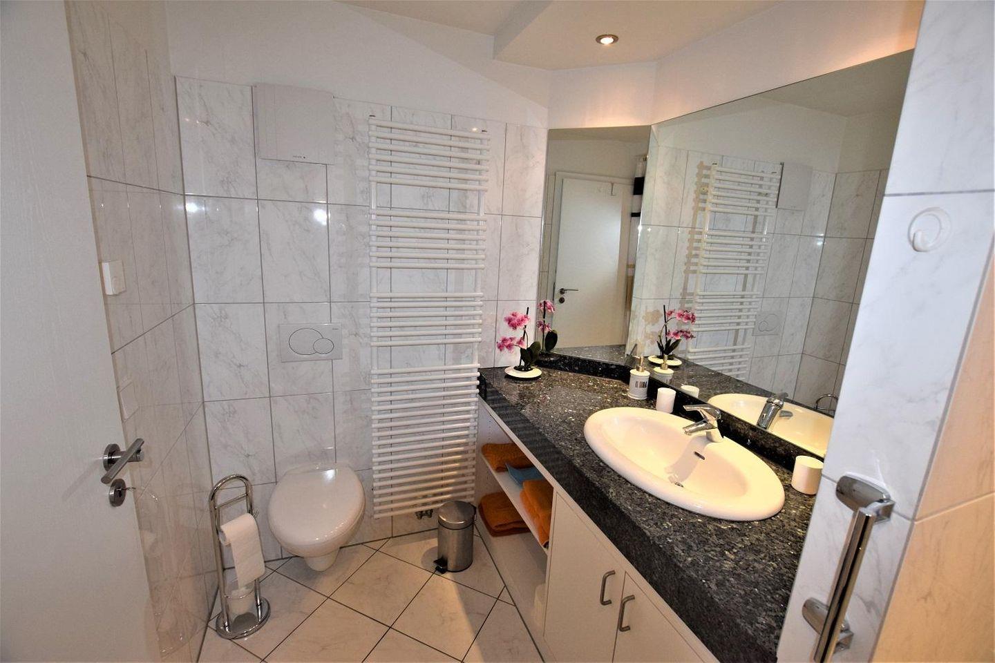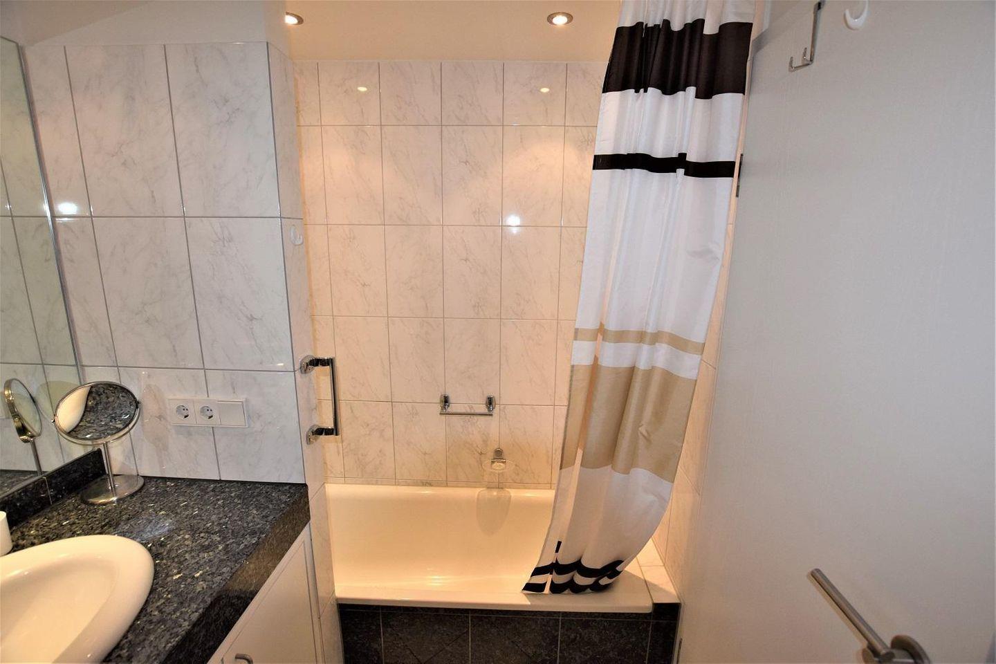 einem Badezimmer mit Badewanne / Dusche WC sowie einem Gäste WC.
