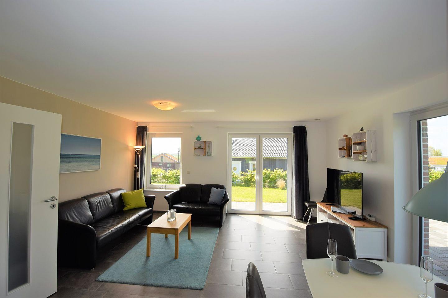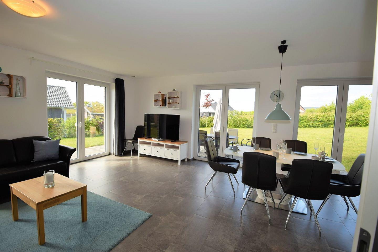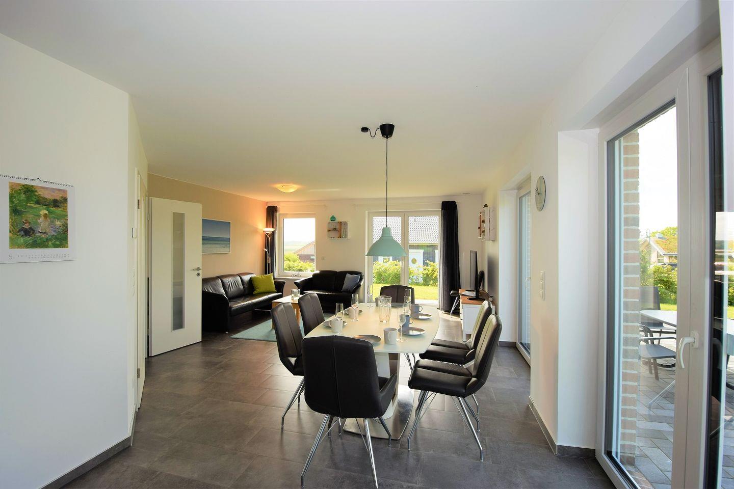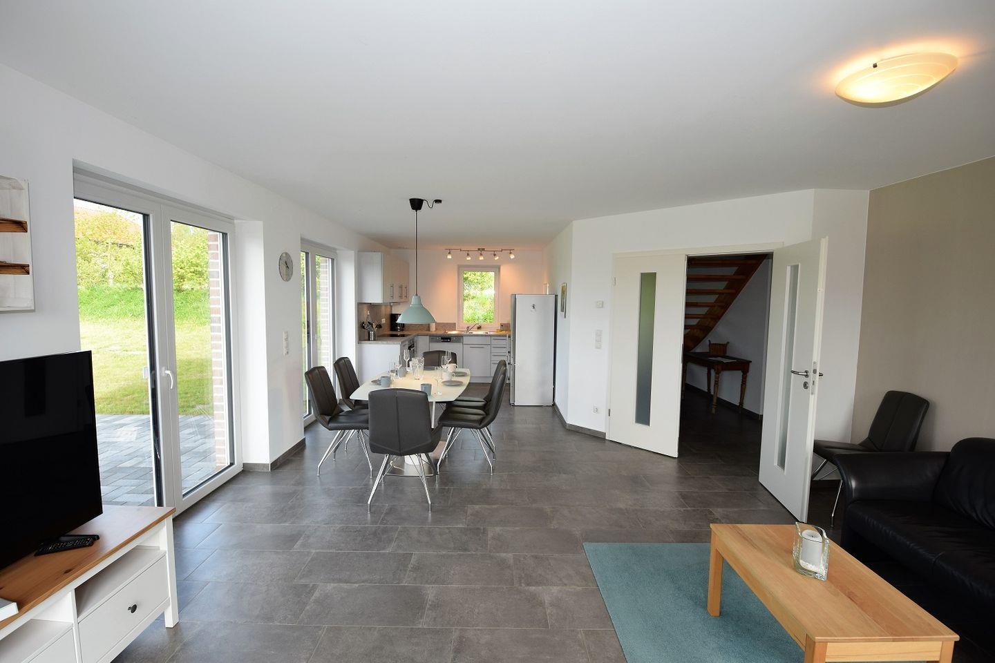 Der großzügige Wohnraum mit offener Küche ist lichtdurchflutet durch eine große Fensterfront zur Terrasse und lädt zum Verweilen ein. Hier können Sie auf dem gemütlichen Sofa entspannen und Ihre Lieblingssendung auf dem TV genießen oder mit Freunden und Familie am Esstisch klönen und schlemmen.