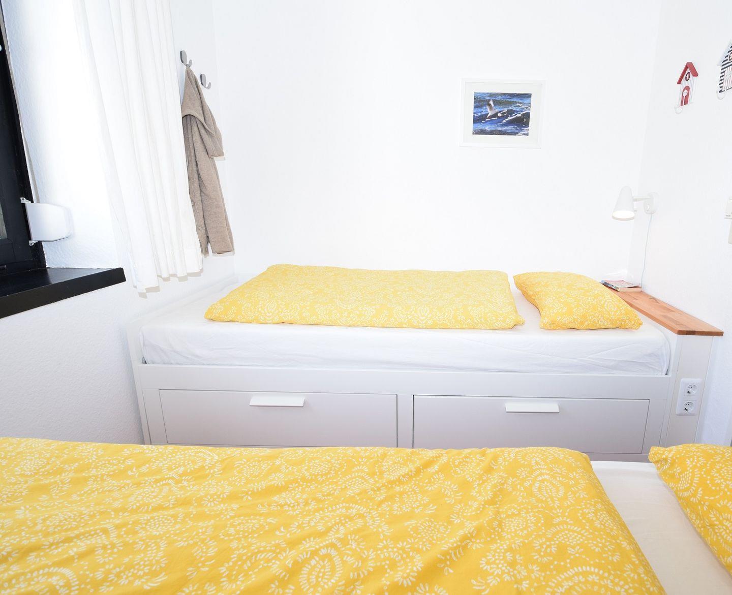 Die Ferienwohnung verfügt über 2 Schlafzimmer. Das erste Schlafzimmer ist mit einem Doppelbett (180x200 cm) und einem großen Kleiderschrank ausgestattet. Das zweite Schlafzimmer hat 2 Einzelbetten (80x200 cm). Ein modernes Badezimmer mit großer Dusche, Waschbecken und WC rundet die Ausstattung ab.