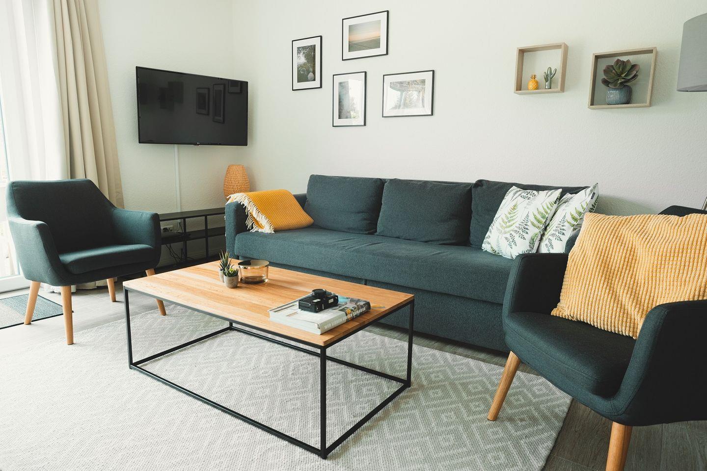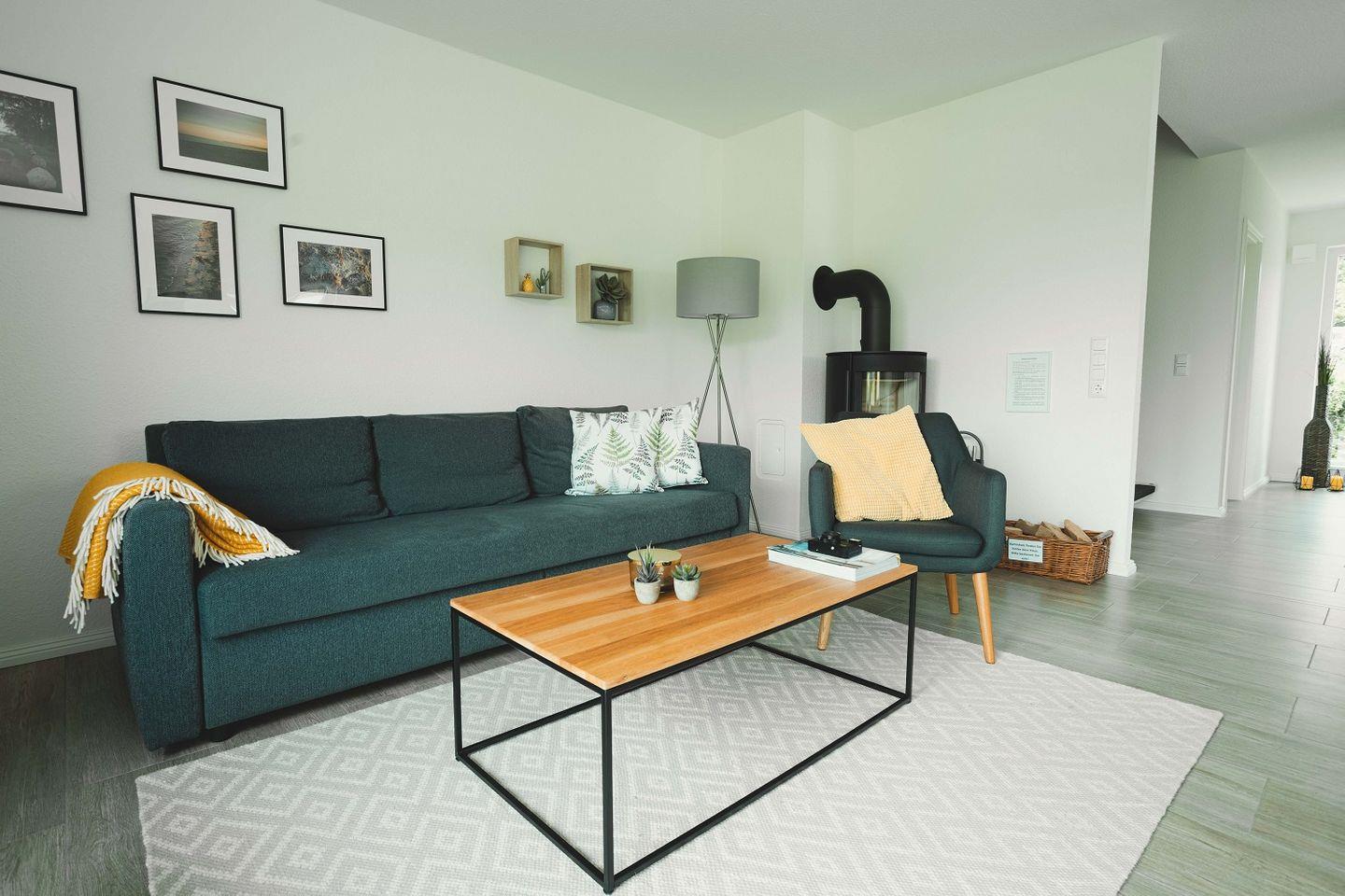 Der große Esstisch ist wie geschaffen für gemeinsame Mahlzeiten und fröhliche Spieleabende. Das bequeme Sofa kann ausgeklappt werden und bietet 2 zusätzliche Schlafmöglichkeiten. Ein Kaminofen sorgt für wohlige Wärme.
