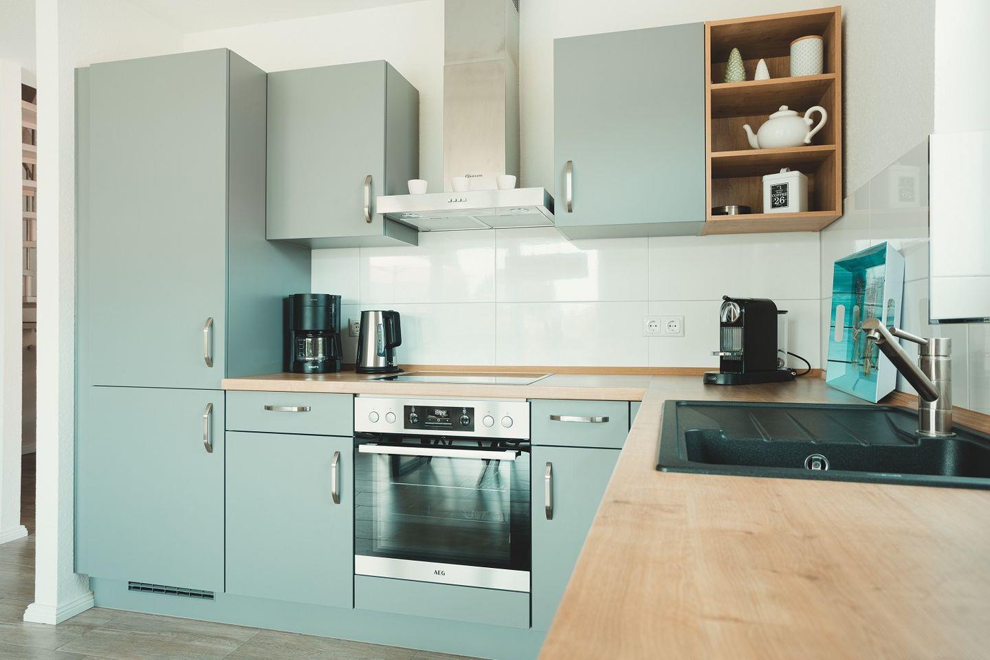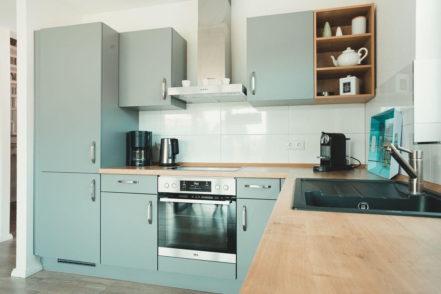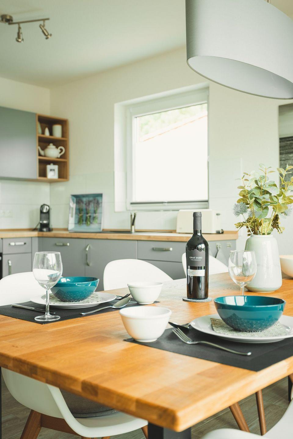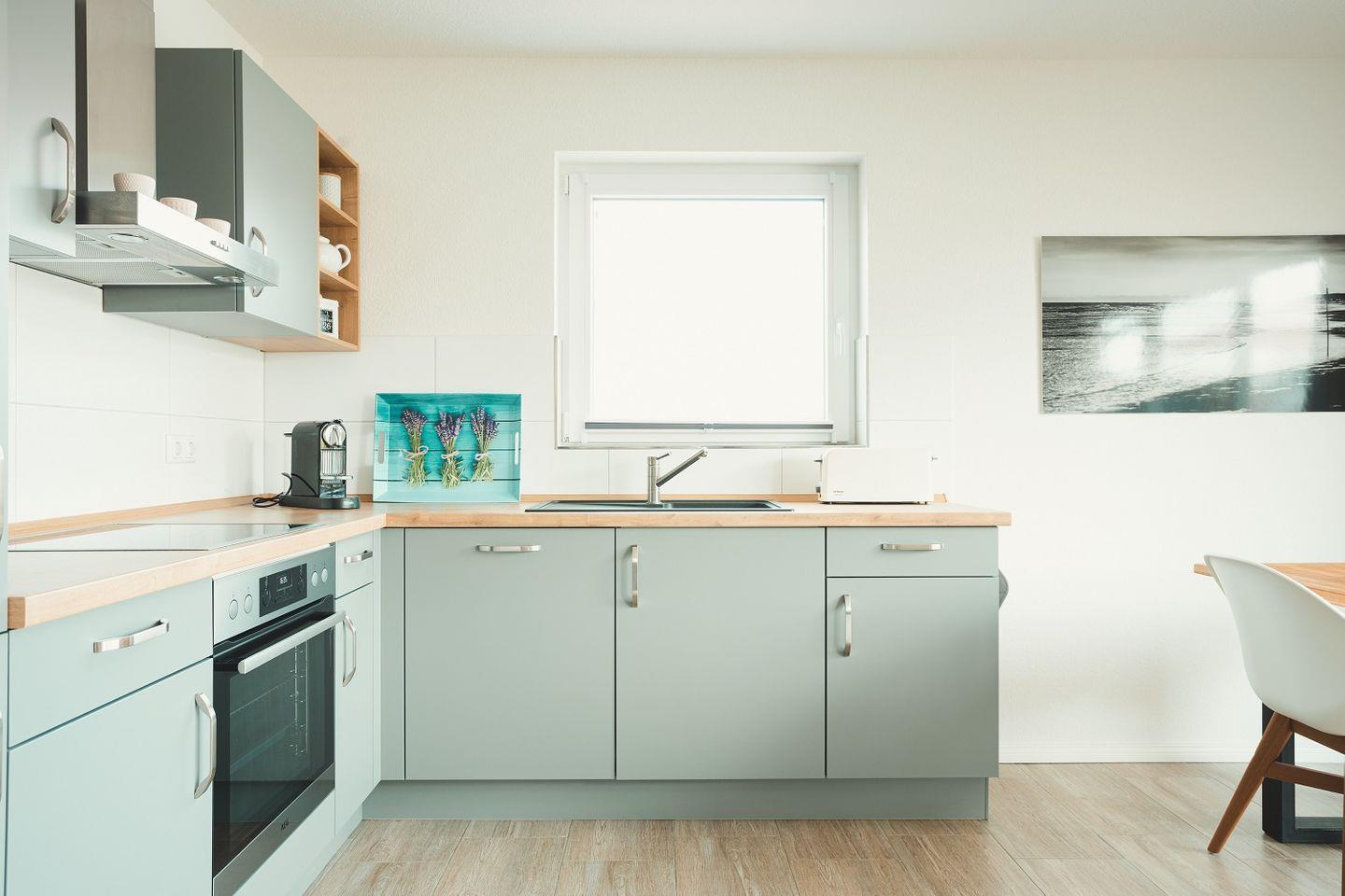 Die Küche ist offen gestaltet und doch ein wenig zurückgesetzt platziert, so dass im Wohnraum viel Fläche für Bewegungsfreiraum sorgt. Die Küche selbst ist ebenso modern eingerichtet und gestaltet wie der Rest des Wohnbereichs. Durch ihre L-Form ist sie besonders geräumig und mit viel Arbeitsfläche ausgestattet. Neben dem Kühlschrank mit Gefriermöglichkeit finden sich hier auch Spülmaschine, Ceranherd mit Backofen, Kaffeemaschine, Toaster, Wasserkocher sowie Geschirr, Gläser und Besteck. Ein zusätzlicher Hauswirtschaftsraum mit Waschmaschine ist ebenfalls vorhanden.
