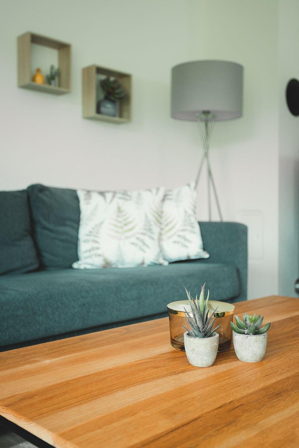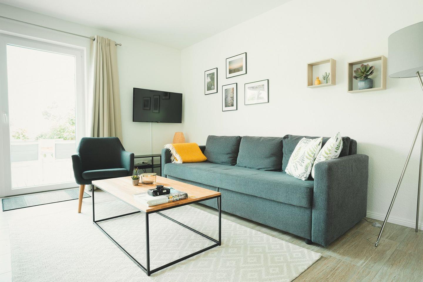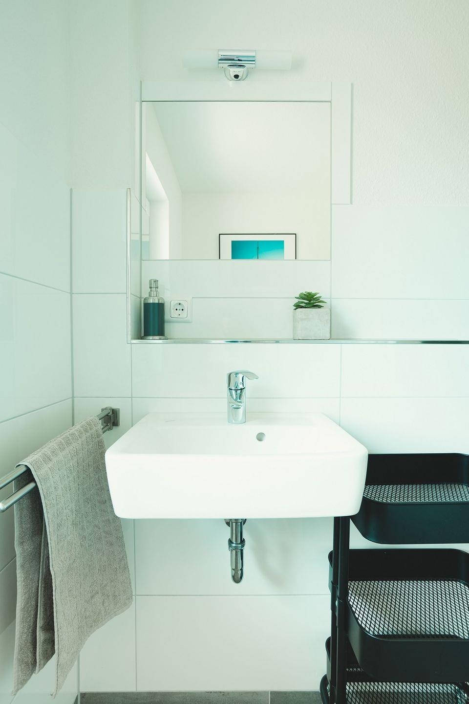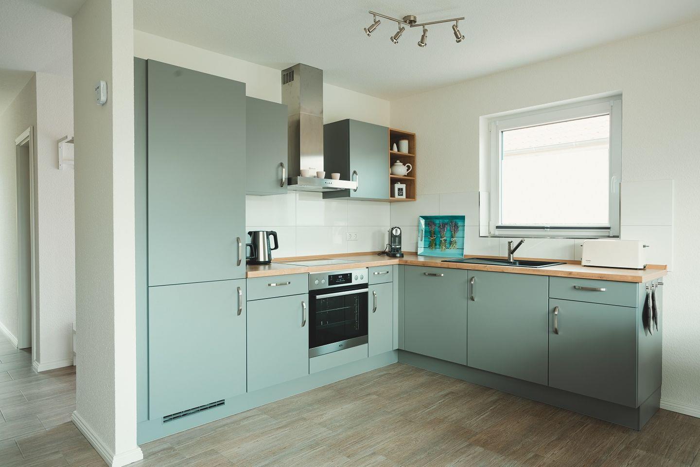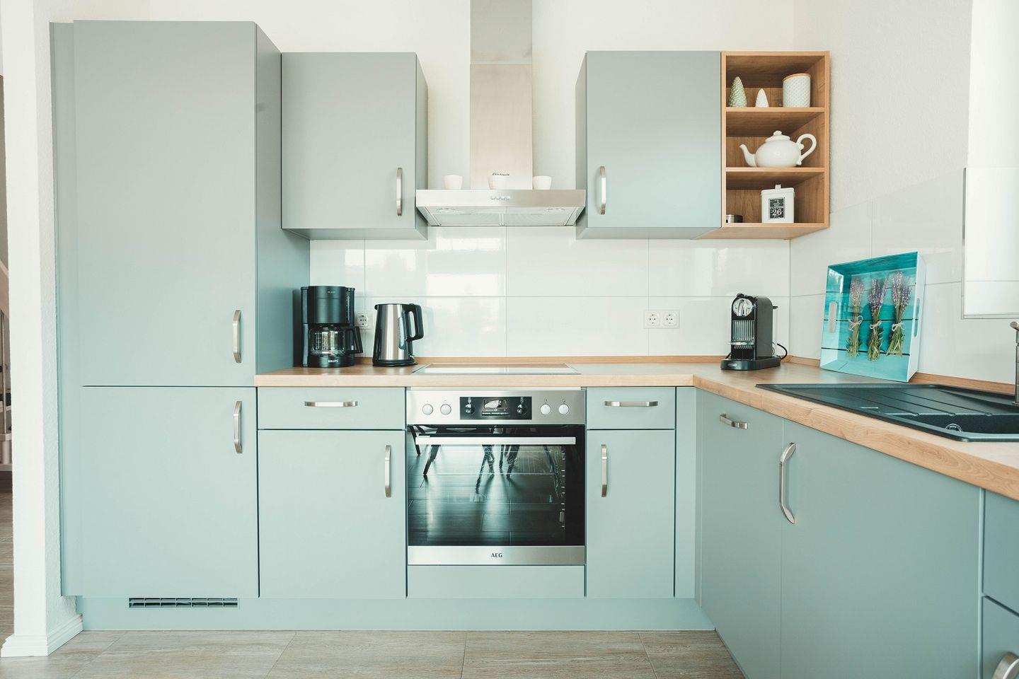 Die Küche ist offen gestaltet und doch ein wenig zurückgesetzt platziert, so dass im Wohnraum viel Fläche für Bewegungsfreiraum sorgt. Die Küche selbst ist ebenso modern eingerichtet und gestaltet wie der Rest des Wohnbereichs. Durch ihre L-Form ist sie besonders geräumig und mit viel Arbeitsfläche ausgestattet. Neben dem Kühlschrank mit Gefriermöglichkeit finden sich hier auch Spülmaschine, Ceranherd mit Backofen, Kaffeemaschine, Toaster, Wasserkocher sowie Geschirr, Gläser und Besteck. Ein zusätzlicher Hauswirtschaftsraum mit Waschmaschine ist ebenfalls vorhanden.