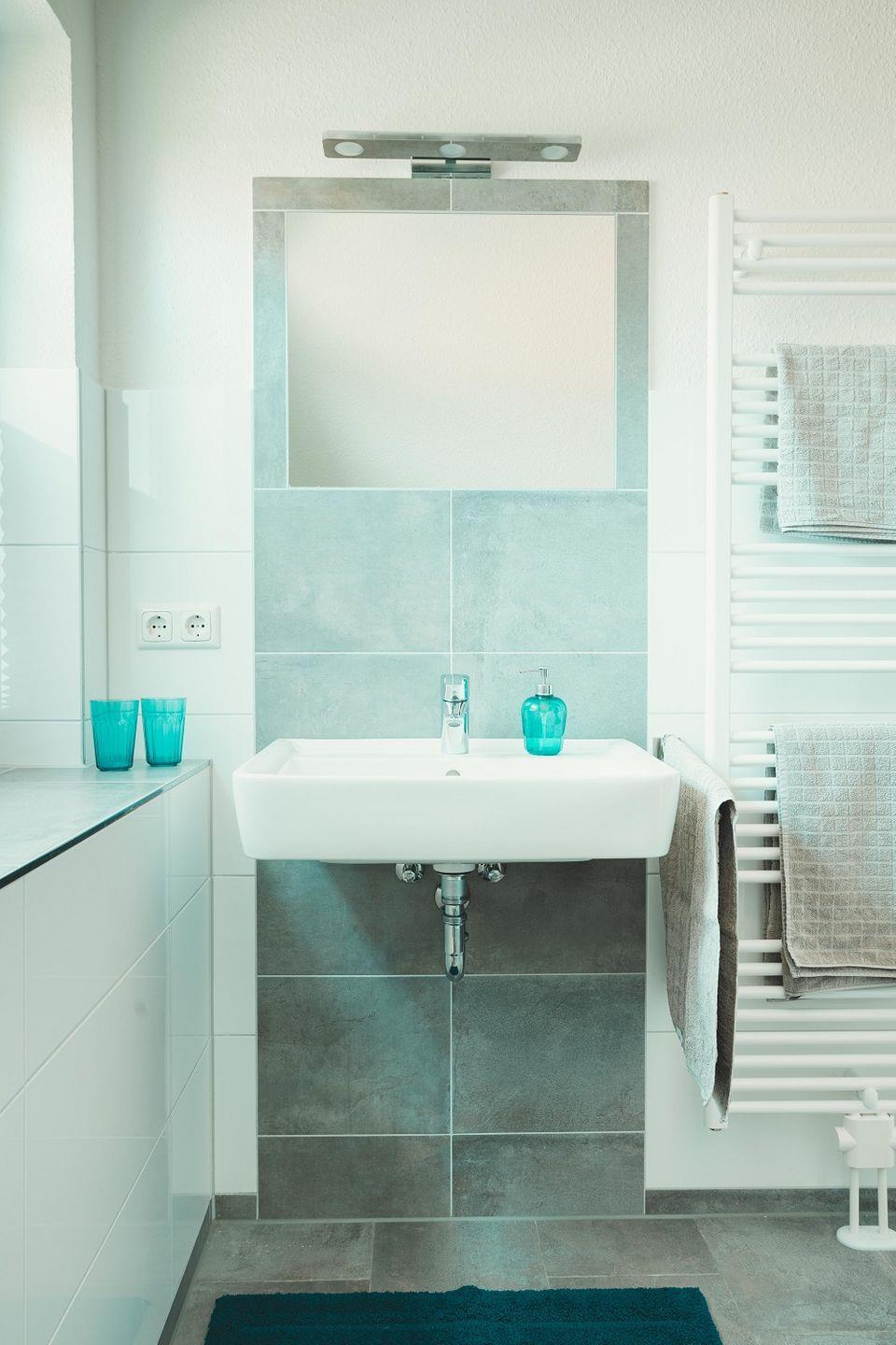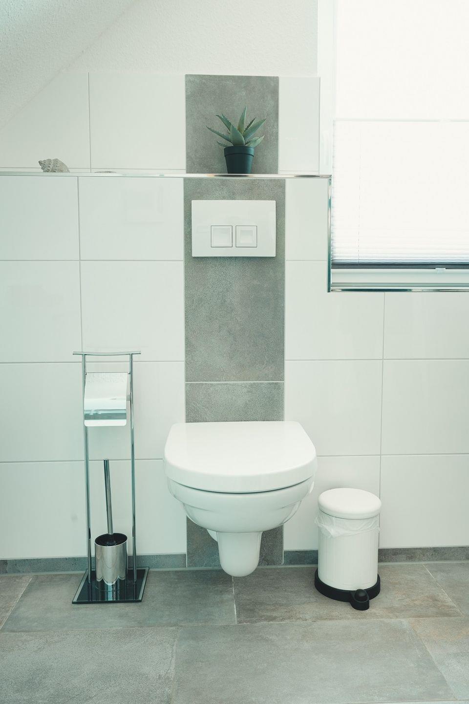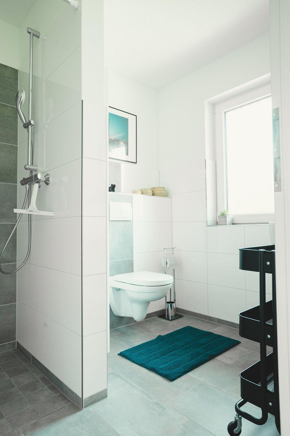 Das Haus verfügt über zwei großzügige Badezimmer mit modernen, grauen Wand- und Bodenfliesen. Beide Bäder sind mit einem Fenster, einer bodentiefen Dusche, Handtuchhaltern, Waschbecken mit Spiegel und WC ausgestattet.