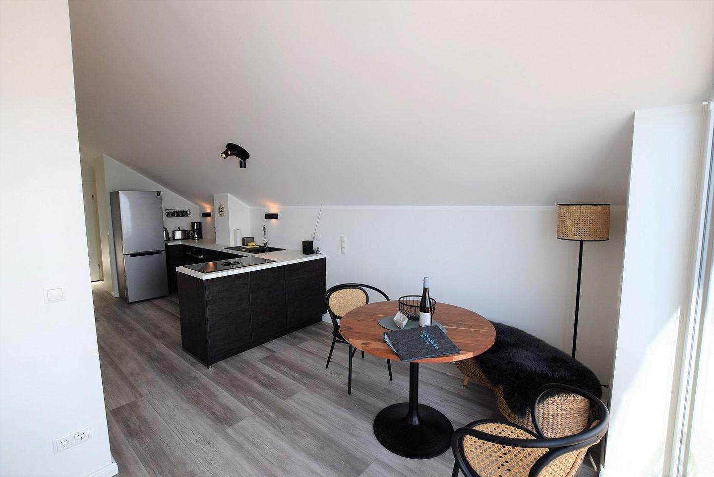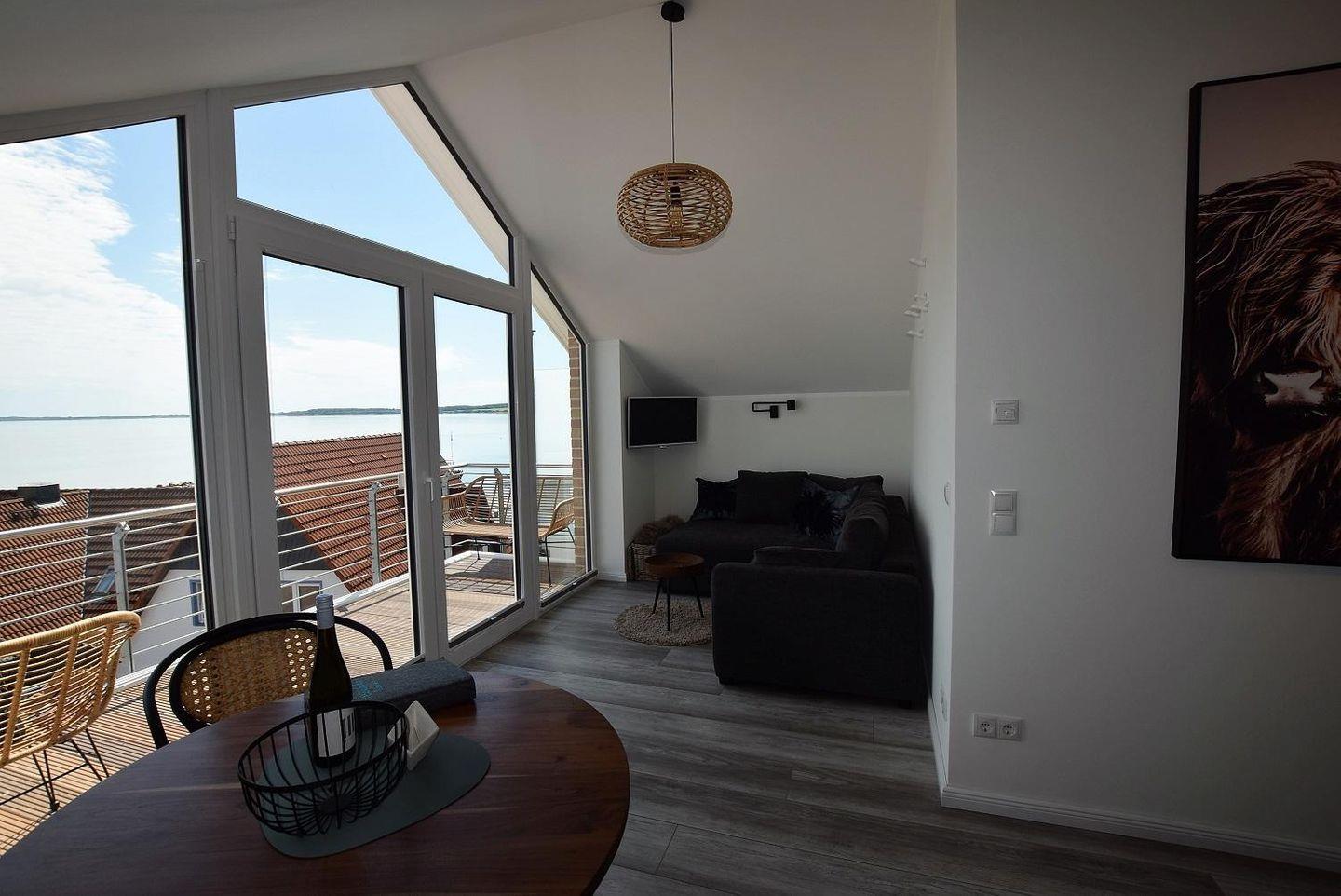 Der helle Wohnraum mit großer Fensterfront und Zugang zum schönen Balkon teilt sich in einen Wohnbereich und eine Essecke mit angrenzender Küchenzeile. Diese ist modern und offen gestaltet und perfekt ausgestattet: So finden Sie hier neben einem Geschirrspüler auch den Induktionsherd mit integriertem Dunstabzug sowie einen Backofen, Kühlschrank mit Gefriermöglichkeit und zahlreiche weitere Küchenutensilien. Ein Toaster und eine Kaffemaschine sowie ein Wasserkocher sind natürlich ebenfalls vorhanden. Durch ihre L-Form bietet die Küchenzeile zudem reichlich Arbeitsfläche und vom Herd einen wunderschönen Blick aufs Wasser. Am runden Esstisch ist Platz für alle Gäste der Unterkunft. Der Wohnbereich ist mit einem bequemen Boxspring-Sofa und Flachbildschirm mit Kabelfernsehen zeitgemäß ausgestattet und lädt zum Verweilen ein.