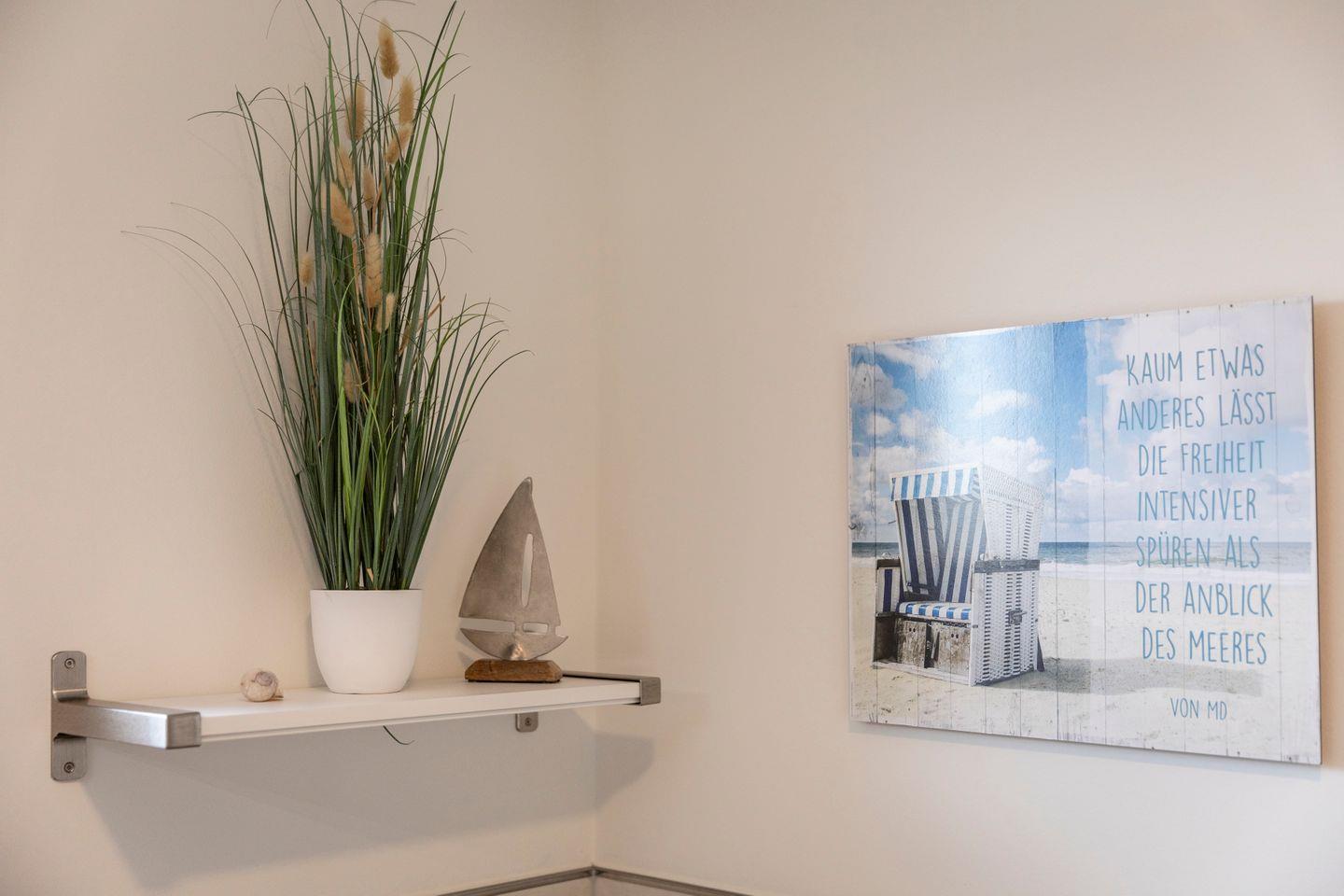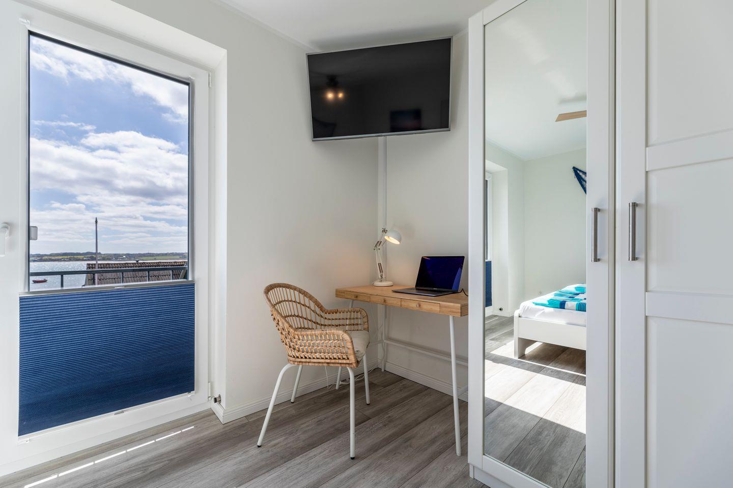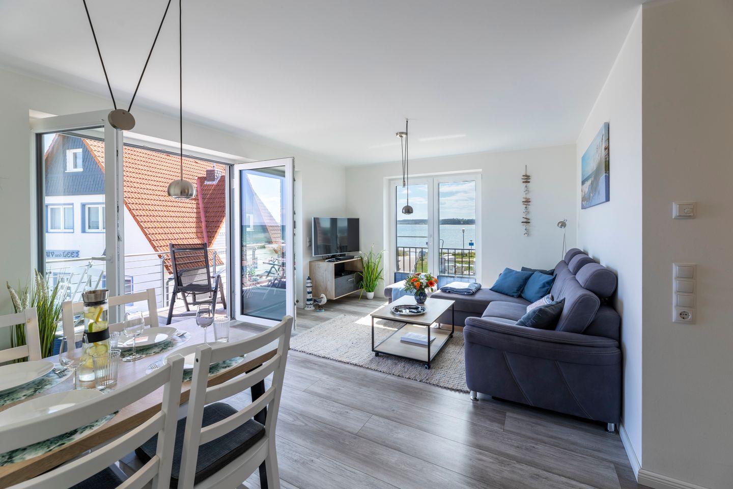 Das Wohnzimmer ist weitläufig und mit einem direkten Zugang zum schönen Balkon ausgestattet. Große Fenster und die doppelflüglige Terrassentür mit Fliegenschutztür sorgen dafür, dass der Raum besonders hell und luftig erscheint. Der Blick kann hier aus allen Fenster auf den wunderschönen, weißen Strand und die tiefblaue Ostsee fallen.