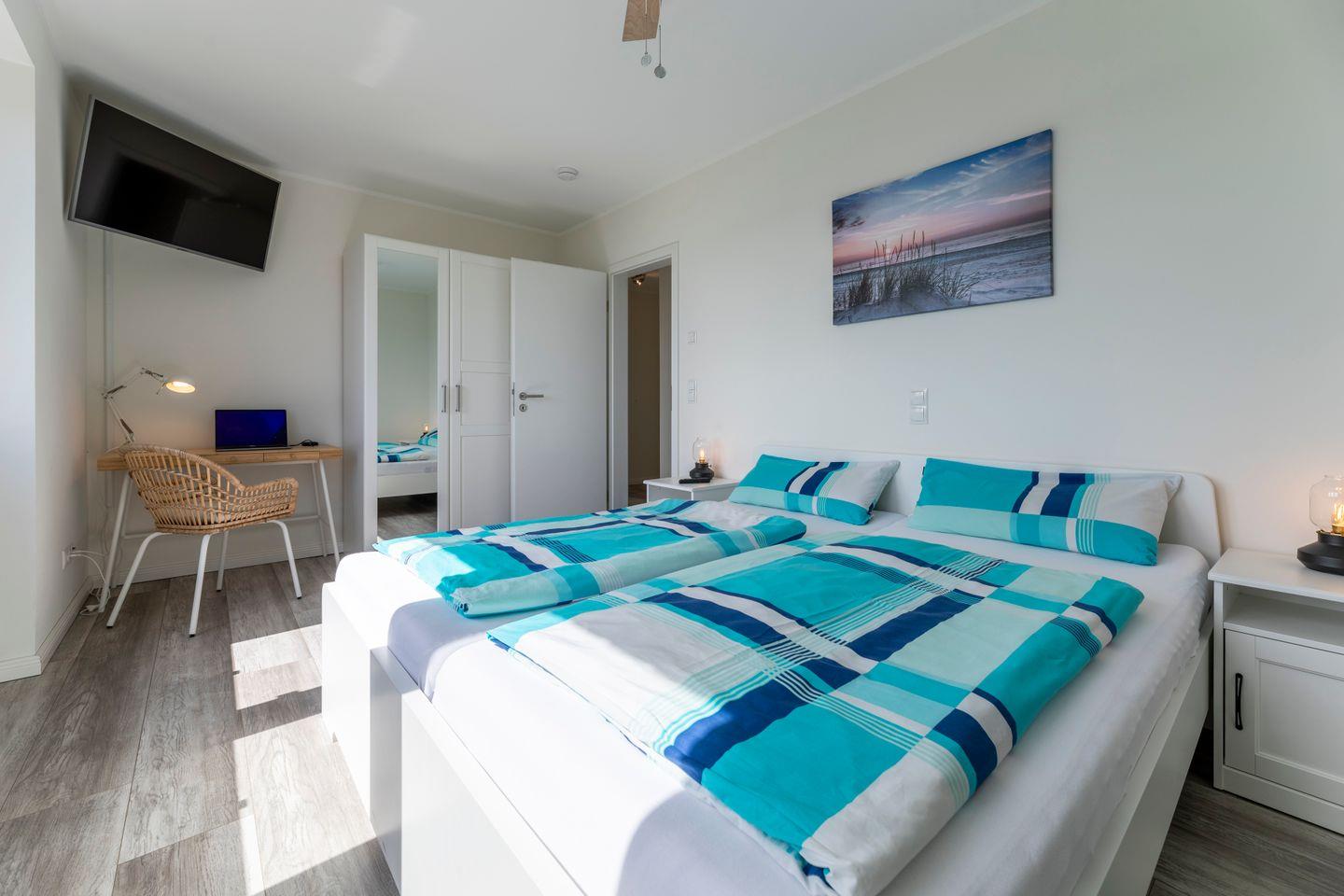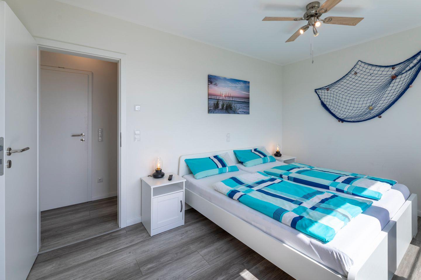 Die zwei Schlafzimmer mit großen Fenstern in südlicher Lage sind besonders hell. Im ersten Schlafzimmer mit Doppelbett und geräumigem Kleiderschrank befindet sich zusätzlich ein Fernseher sowie ein Deckenventilator.